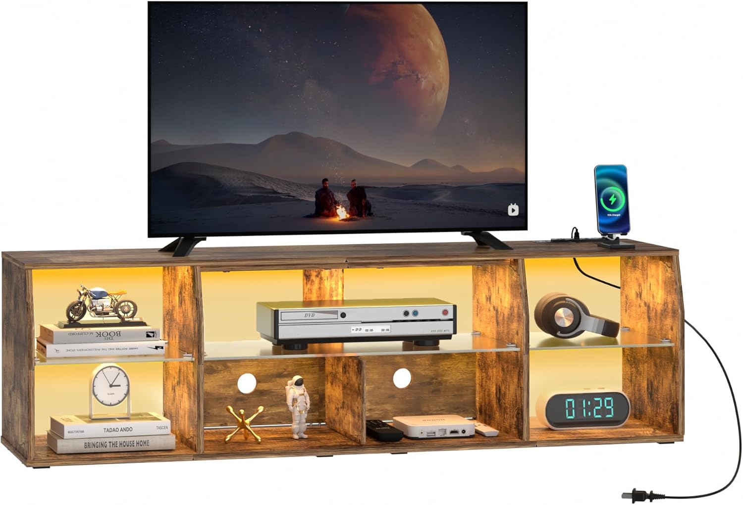 VECELO LED TV Stand for 65 inch Entertainment Center with Power Outlets, Industrial Television Cabinet with 7 Open Storage Shelves, for Living Room and Bedroom, Retro Brown, 65inch