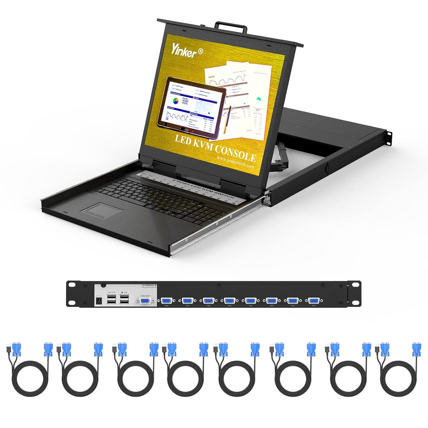 - Yinker 8 Port VGA KVM Switch, with integrated 19 inch LCD monitor, US keyboard and touchpad, allows manage and control 8 computers or servers.
