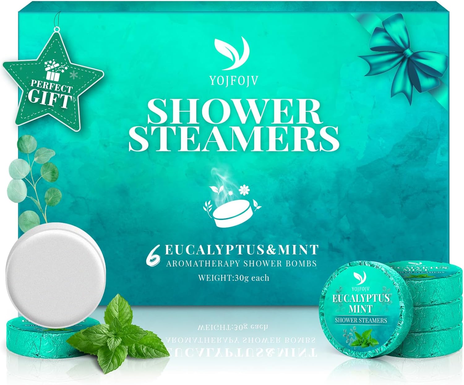 - [Organic, Natural, No Artificial Colours] YOJFOJV shower tablets is different from other shower steamers in that we use small scale distillation to extract organic essential oils from natural mint and eucalyptus leaves for a longer-lasting, stronger and natural scent, and the production process is purely handmade, with no artificial colours added to it, so that it won’t stain your floors when you use it
