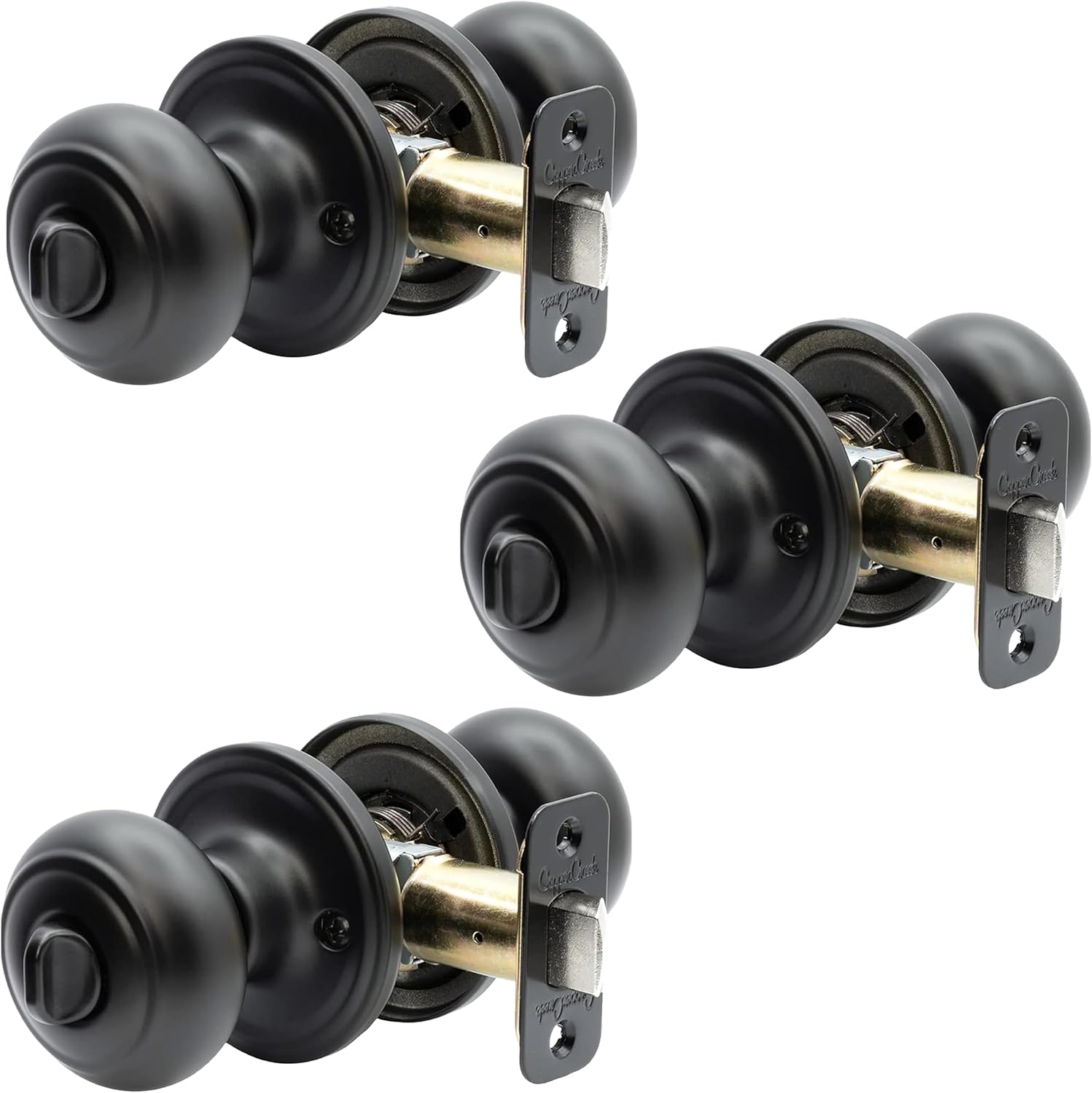 Copper Creek Matte Black Door Knobs – Round Colonial Knob with Privacy Locking Function for Home Improvement, 3 Pack – Fits All Standard Doors – Locking Door Knob for Bedroom and Bathroom Use
