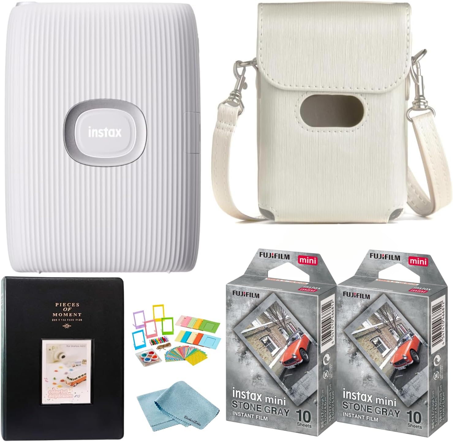 BluebirdSales Fujifilm Instant Mini Link 2 Smartphone Printer + Fuji Stone Gray Film (20 Sheets) Photo Accessory Kit (Photo Frames + Album), Carrying Case + Microfiber Cleaning Cloth (Clay White)