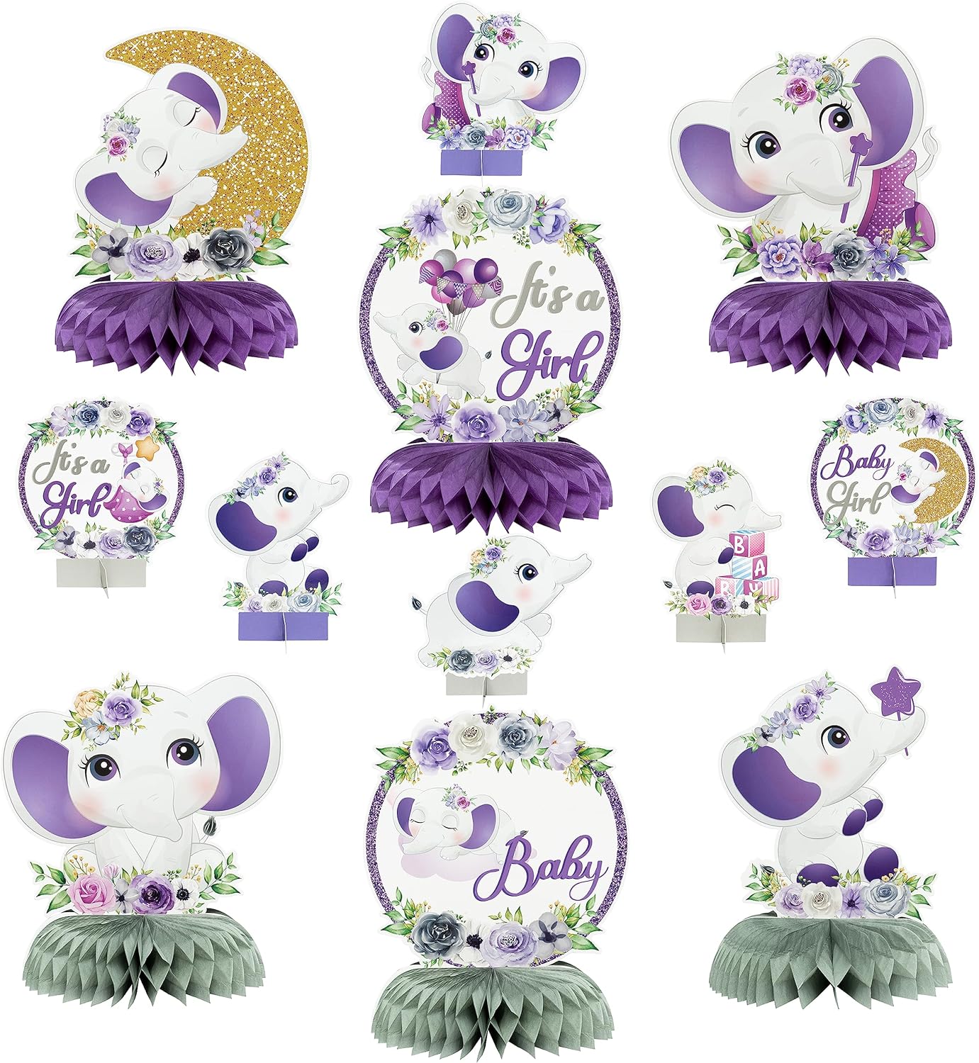 Specification: 12Pcs Purple Floral Elephant Honeycomb Centerpieces It’s a Girl Baby Shower Party Table Decorations Gender Reveal Little Peanut Cutout Welcome Baby Party Table Toppers Photo Props Decor for Baby Girls
