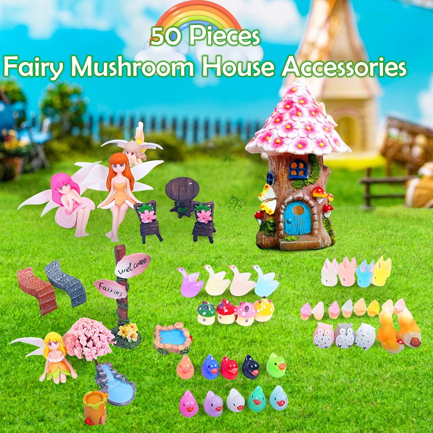 Garden Accessories Set: You will receive 50 carefully designed garden accessories in different styles and shades, including 1 piece solar fairy house, 49 pieces garden miniature decorations – such as fairies, table and chair set, rabbit, swan, squirrel, rabbit , birds and a series of animals. The kit contains everything you need to create a miniature garden, with enough quantity and beautiful combinations to fully meet your decorative needs.