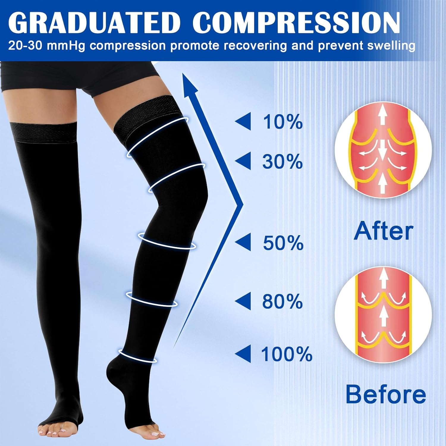 Specification: Ailaka Thigh High Medical Compression Stockings for Women Men, Open Toe Firm 20-30 mmHg Graduated Compression with Silicone Band for Varicose Veins, Edema, Post-Surgery