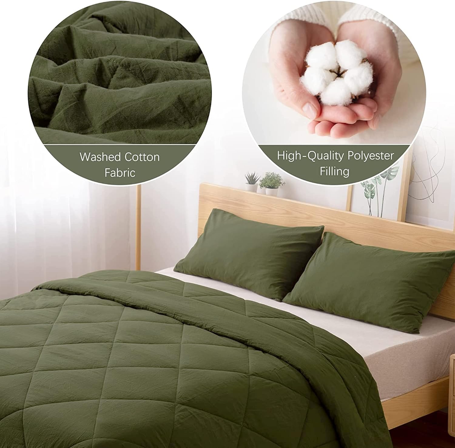 Specification: ATsense Green Comforter Set King Size, 100% Washed Cotton Linen Feel Soft, Dark Olive Green Comforter Lightweight and Durable, 3pcs Forest Green Bedding Set, Army Green Comforter for All Season