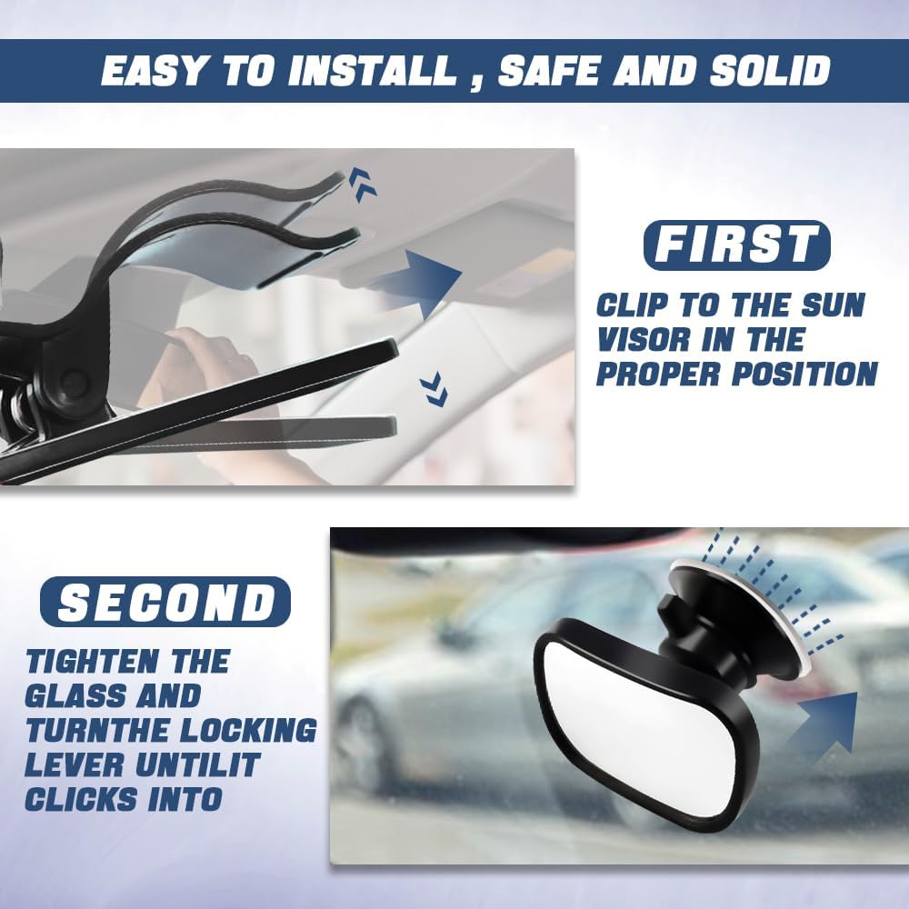 • [Easy and reliable installation]: There are two ways to install the car rear facing view mirror, it has two kinds of clamp and suction base, you can choose a more convenient way for you to install, such as clamping on the sun visor or adsorption on the roof, after installation is very stable, will not easily loose, even when driving on the bumpy road can maintain stability.
