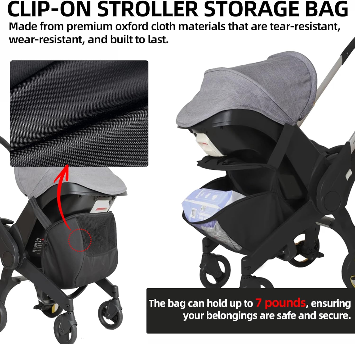 • CLIP-ON STROLLER STORAGE BAG – Made from premium oxford cloth materials that are tear-resistant, wear-resistant, and built to last. The bag can hold up to 7 pounds, ensuring your belongings are safe and secure.