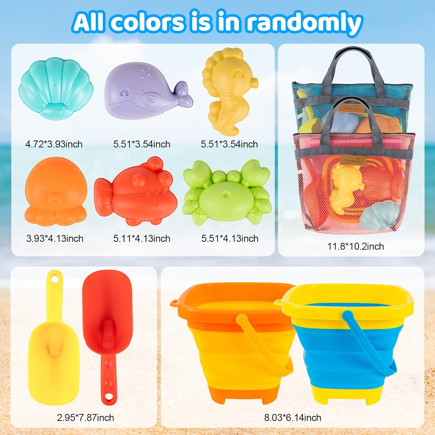 All-In-One Beach Toy Set for Your Child: This comprehensive collection features all the essential beach toys your little one needs for an exciting day at the beach! The beach toy set includes 6 sand animal molds, 2 foldable buckets, 2 sand shovels and 2 beach shell bags, providing verities of possibilities for creative play.