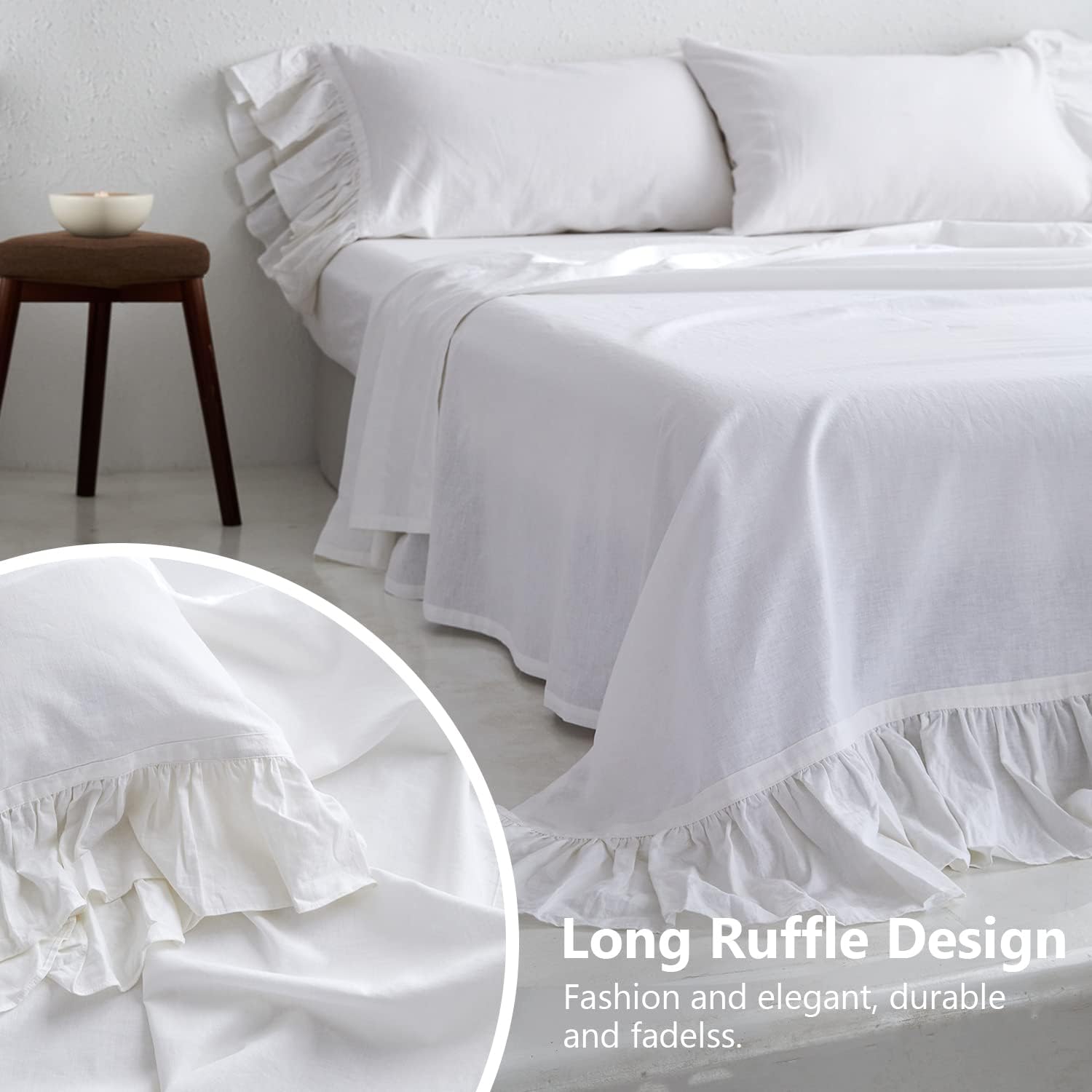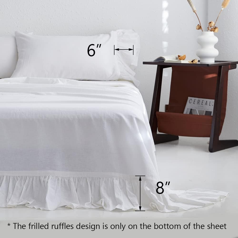 Specification: Belgian Linen Sheet Set with Long Ruffles 4pcs (1 Flat Sheet, 1 Fitted Sheet & 2 Pillowcases) Solid Shabby Vintage Chic Country Style Frilled Farmhouse Bed Sheet (Long-White, King)