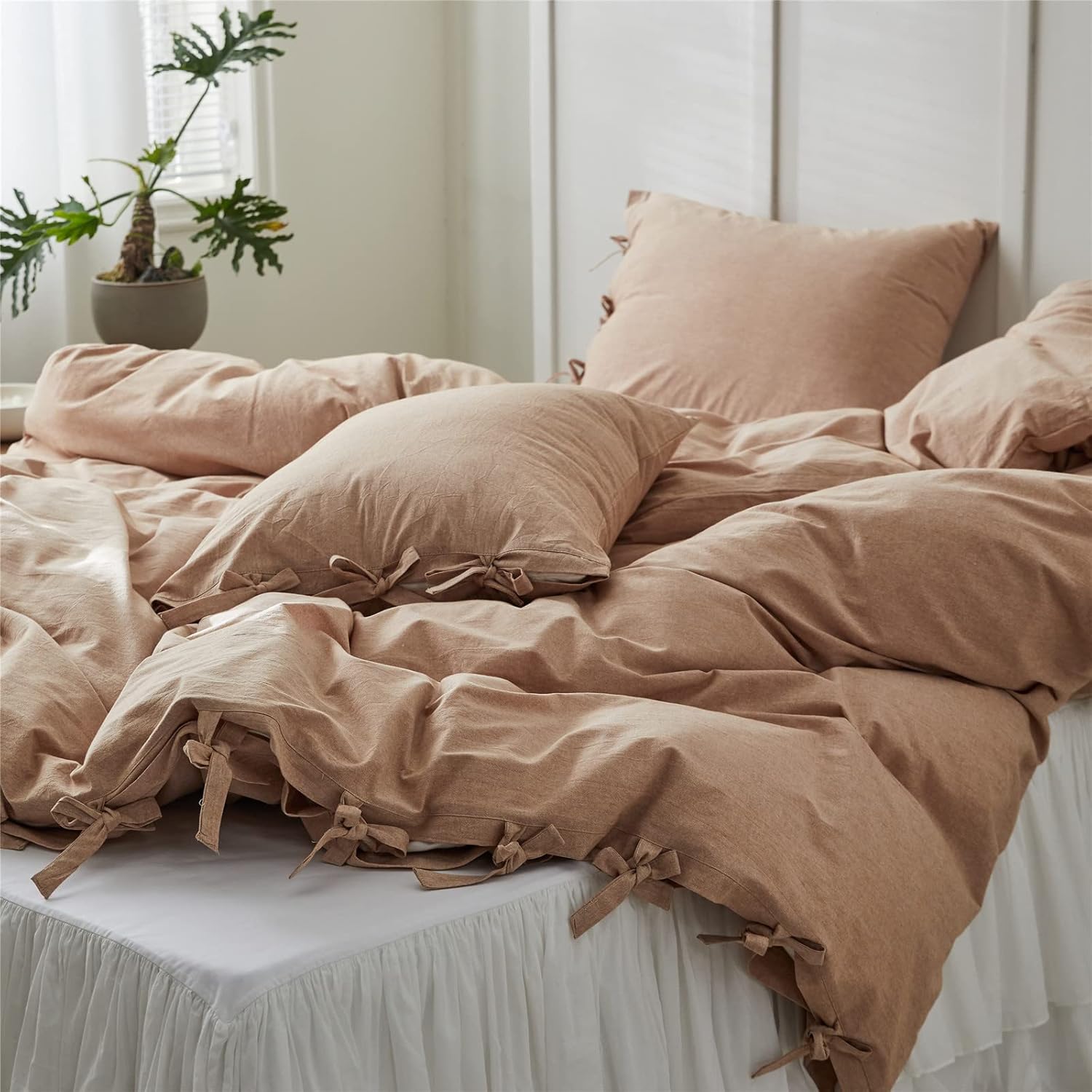 Specification: BISELINA 100% Washed Cotton Duvet Cover Set 3pcs with Bowknot Ties Strap Solid Color Linen Like Textured Durable Breathable Soft Comfy Chic Bedding (Queen, Cinnamon)