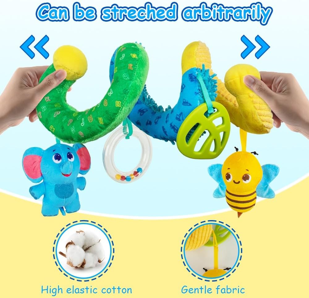 [Car Seat Toys For Babies 0-6 Months]- Singing elephants newborn baby toy , press the elephant to listen to soothing and fun songs, soothing restless babies with music. There are also crinkle bee wings, these interesting little sounds will help babies with auditory development, it is a great baby music toy.