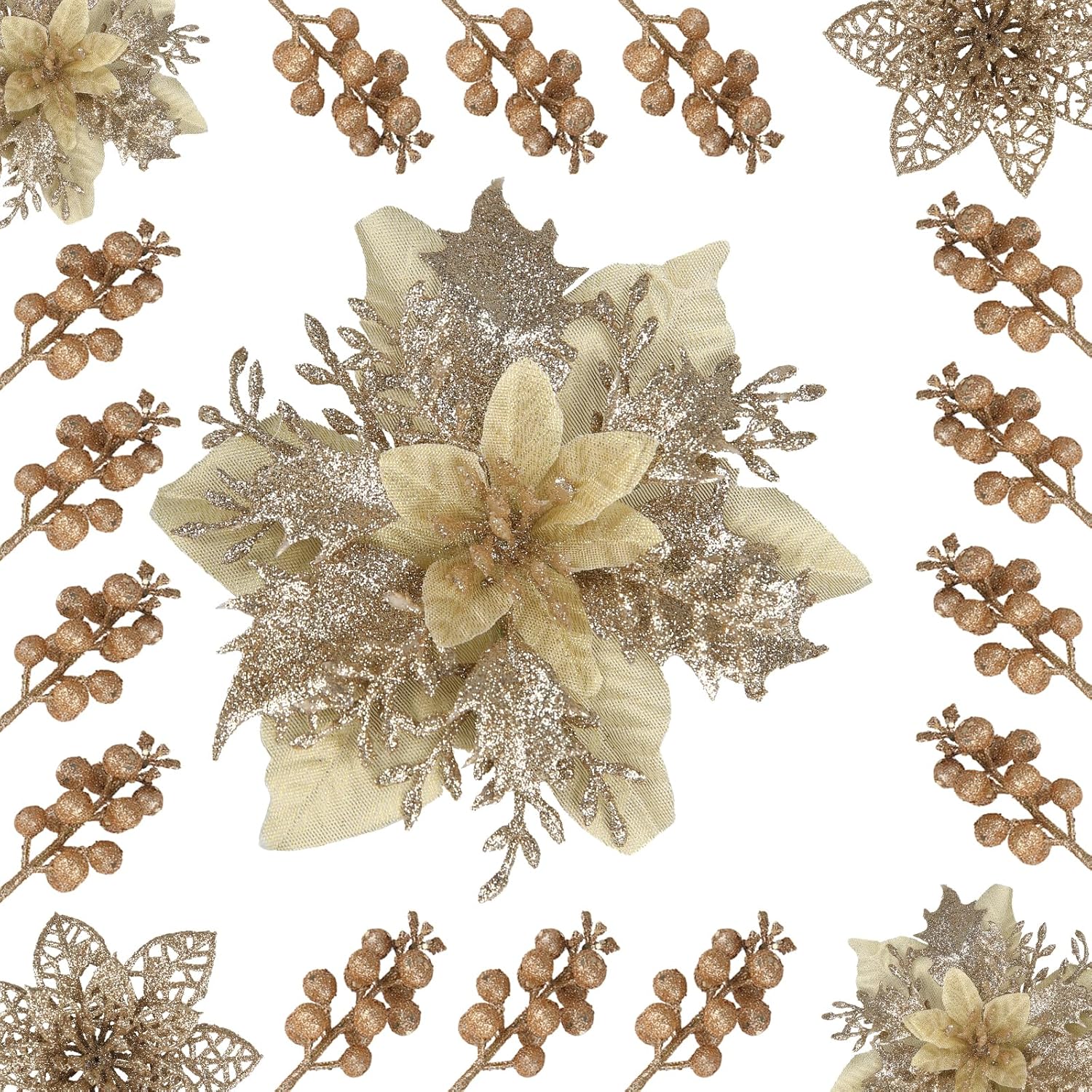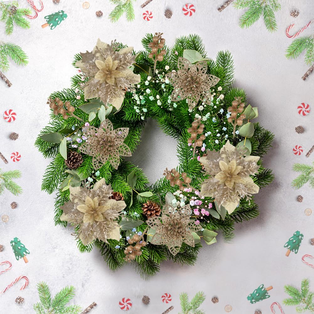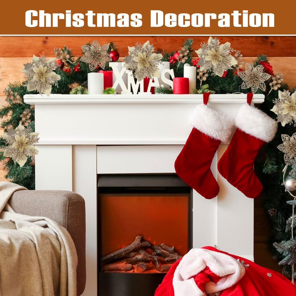 Specification: Champagne Poinsettias Artificial Christmas Flowers, 28 Pack Artificial Christmas Flowers and Berry Stems for Christmas Tree Xmas Decorations Home Decor for Wreath Holiday Weeding Party Indoor Outdoor