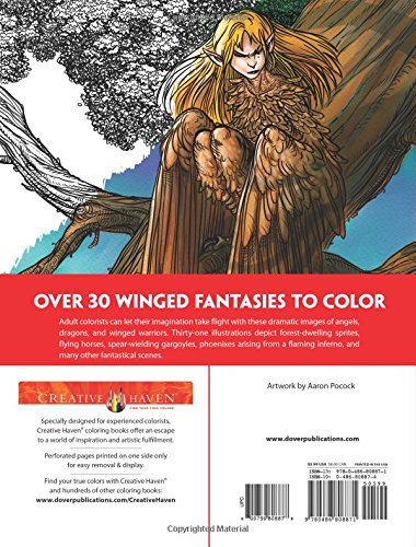 Adult colorists can let their imagination take flight with these dramatic images of angels, dragons, and winged warriors. Thirty-one illustrations depict forest-dwelling sprites, flying horses, spear-wielding gargoyles, phoenixes arising from a flaming inferno, and many other fantastical scenes. Illustrations are printed on one side of perforated pages for easy removal and display. Specially designed for experienced colorists, Winged Fantasy and other Creative Haven® adult coloring books offer an escape to a world of inspiration and artistic fulfillment. Each title is also an effective and fun-filled way to relax and reduce stress.