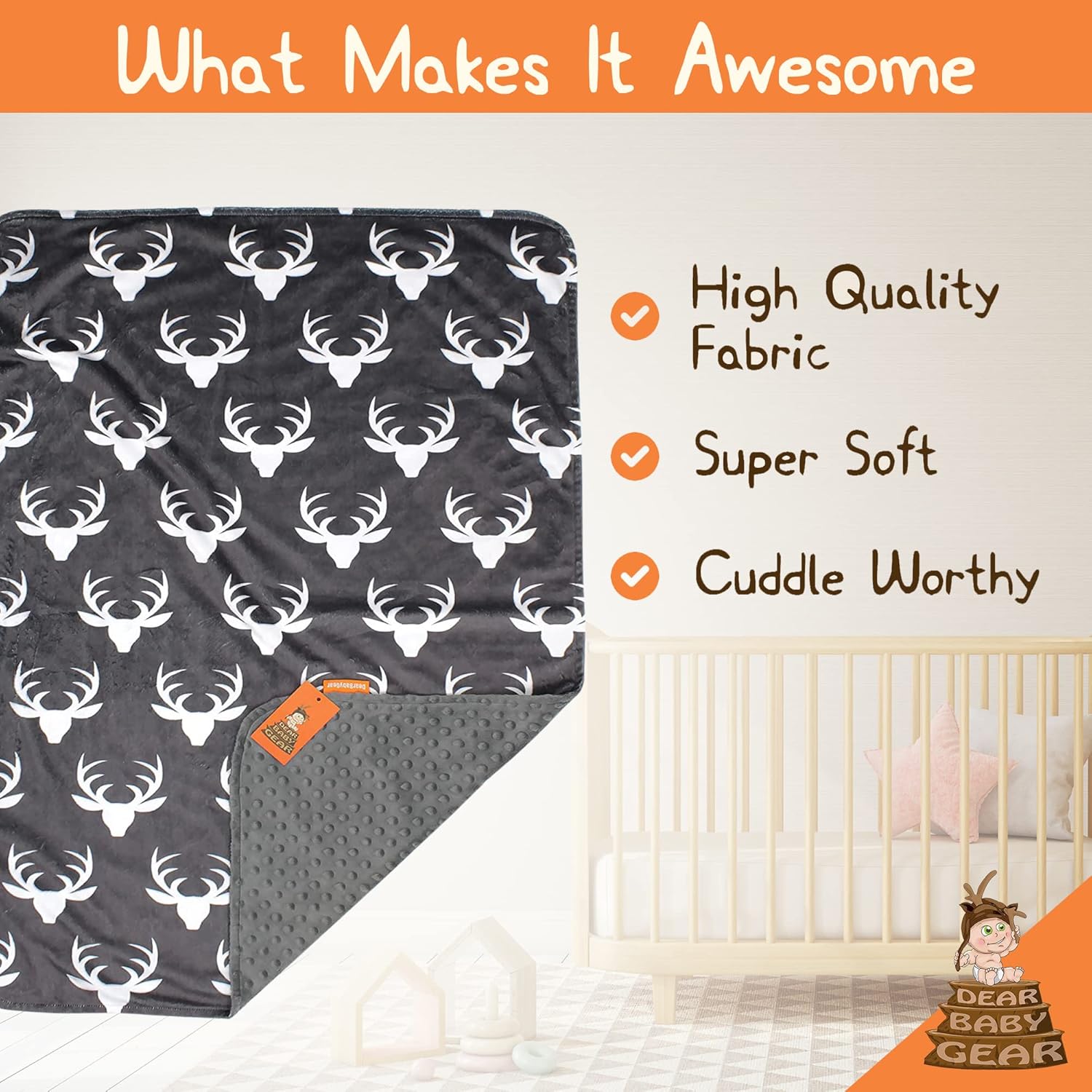Specification: Dear Baby Gear Baby Blankets – Baby Essentials, Newborn Essentials, and Cute Stuff for Baby – for Baby Boy and Baby Girl – Deer Antlers, Grey Dot, Double Layer 38″ x 29″