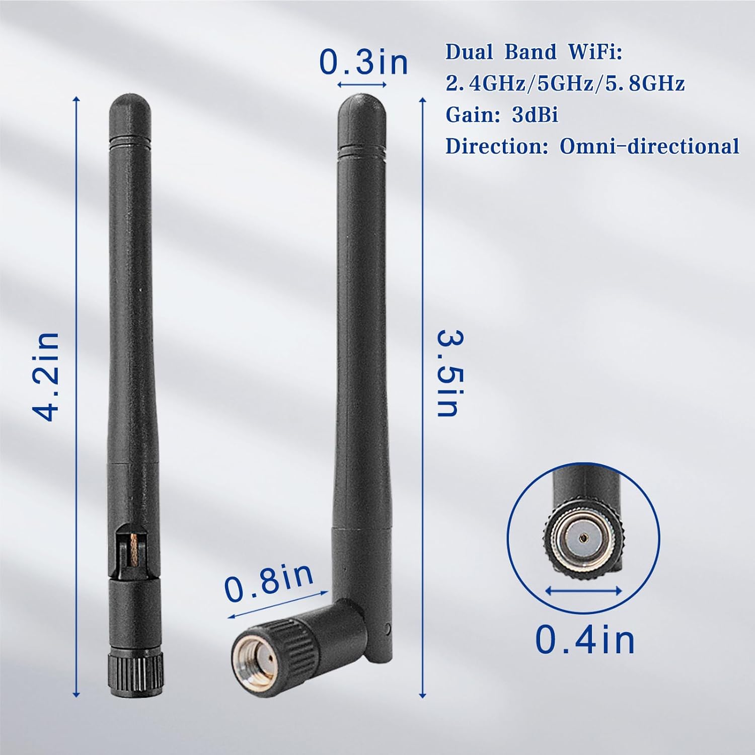 Specification: Dual Band WiFi Antenna, 2.4GHz 5GHz 5.8GHz 3dBi MIMO RP-SMA Male (2-Pack), Directional Antenna for Desktop PC, Security Cameras, Video Surveillance, Wireless Network Cards,Bluetooth Antenna