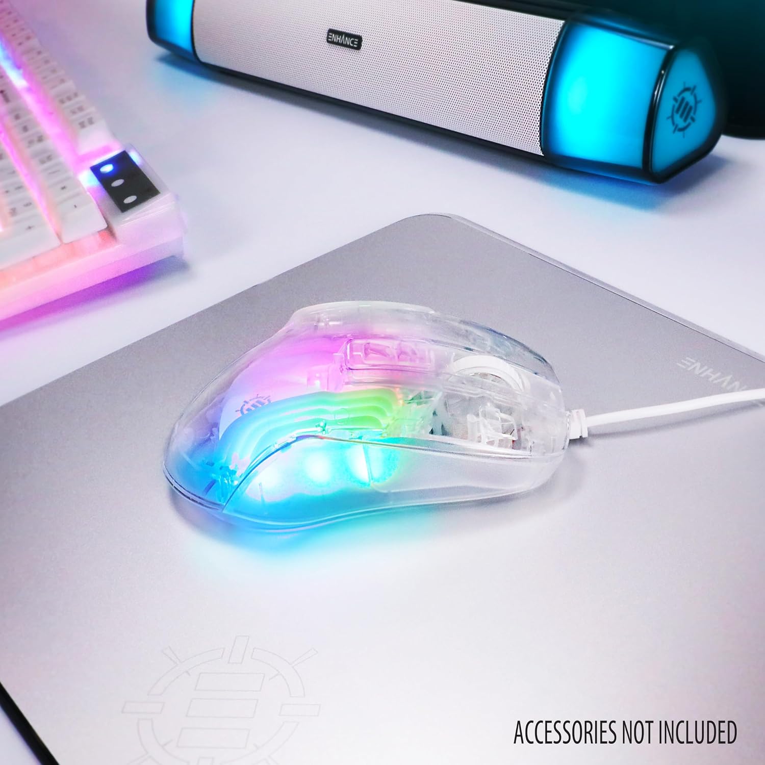 ENHANCE Theorem 3 White Gaming Mouse – Wired Mouse for PC with 7 Programmable Buttons, 13 Color Modes, Adjustable 7200 DPI, Ergonomic Gaming Mouse with Clear, White Design – Software for LEDs, Macros