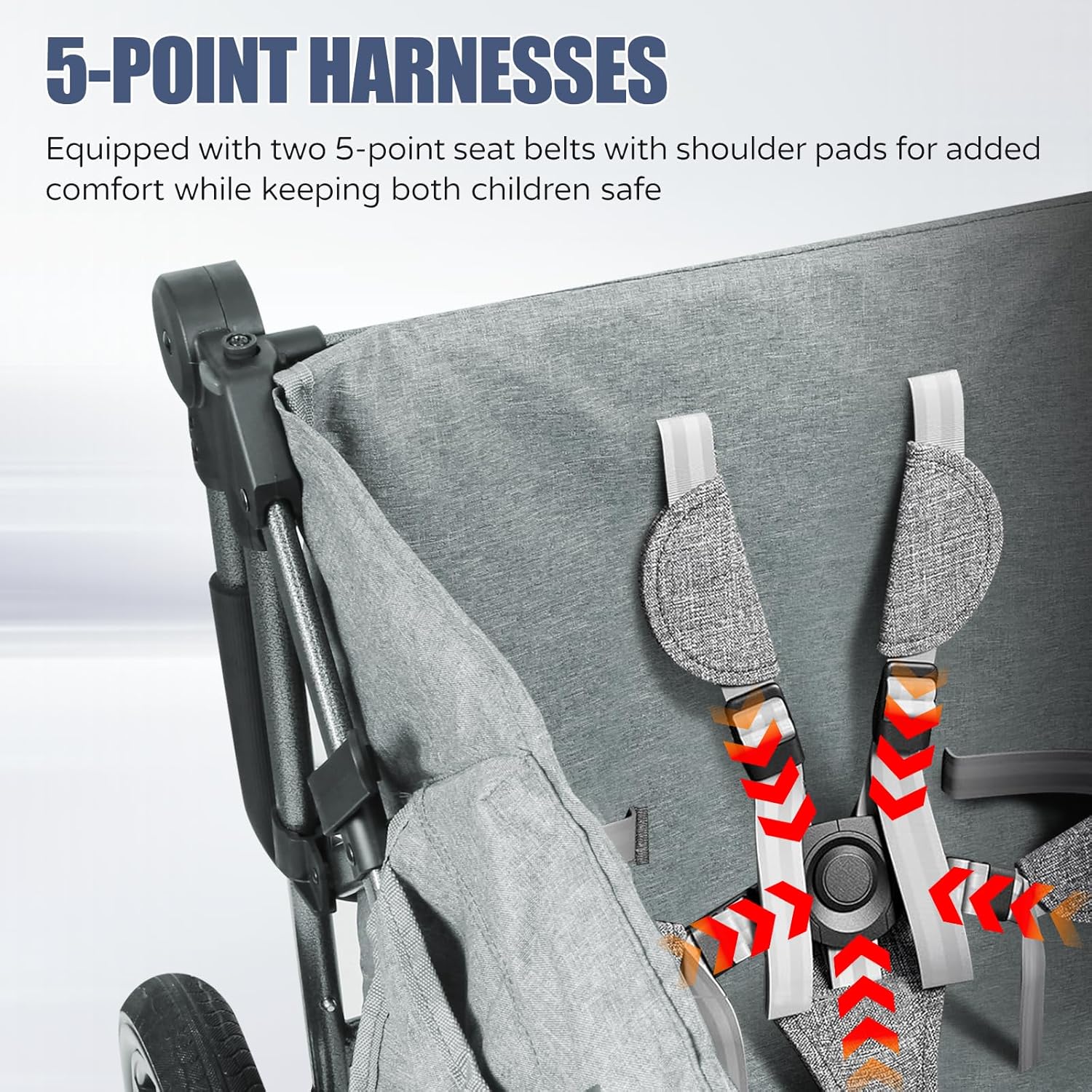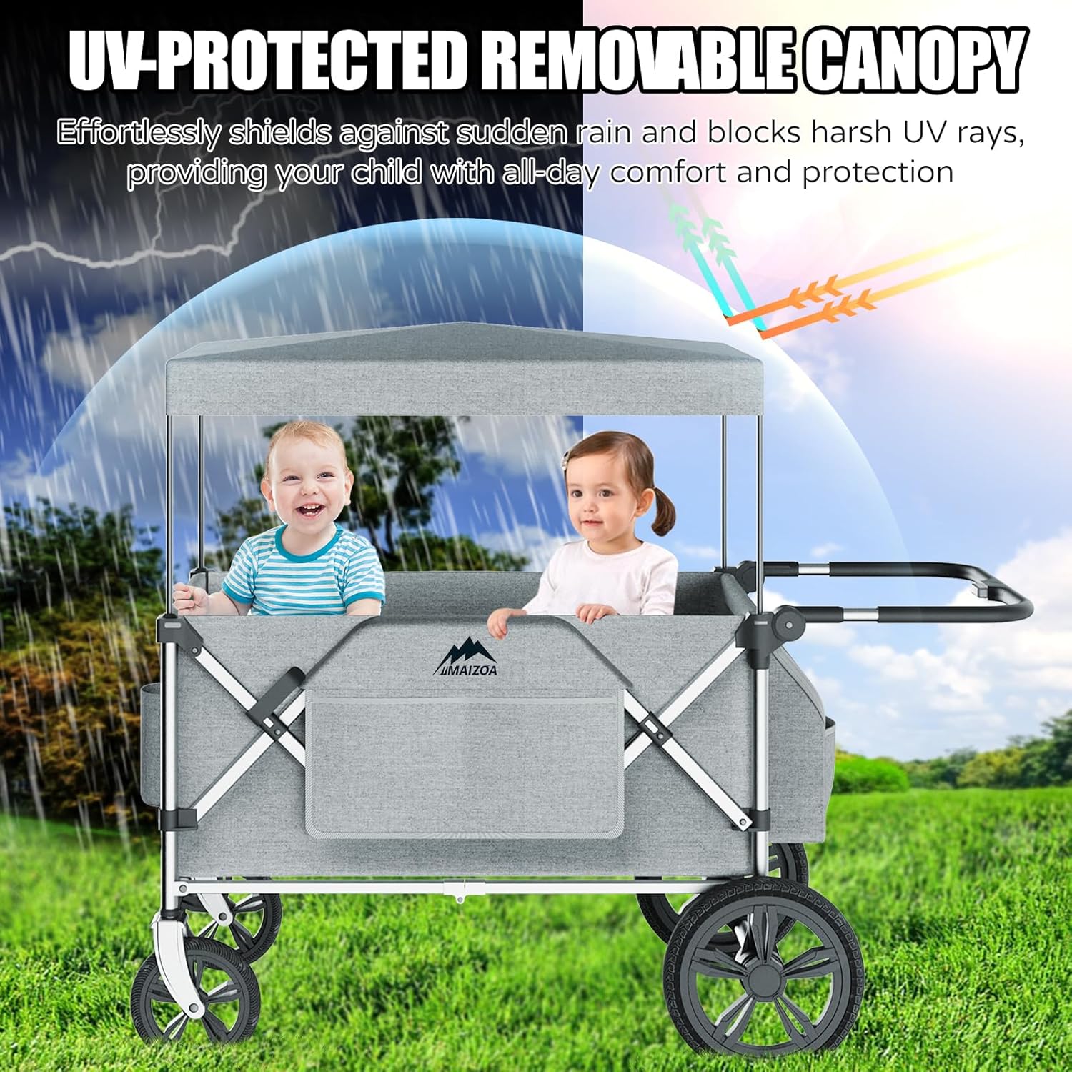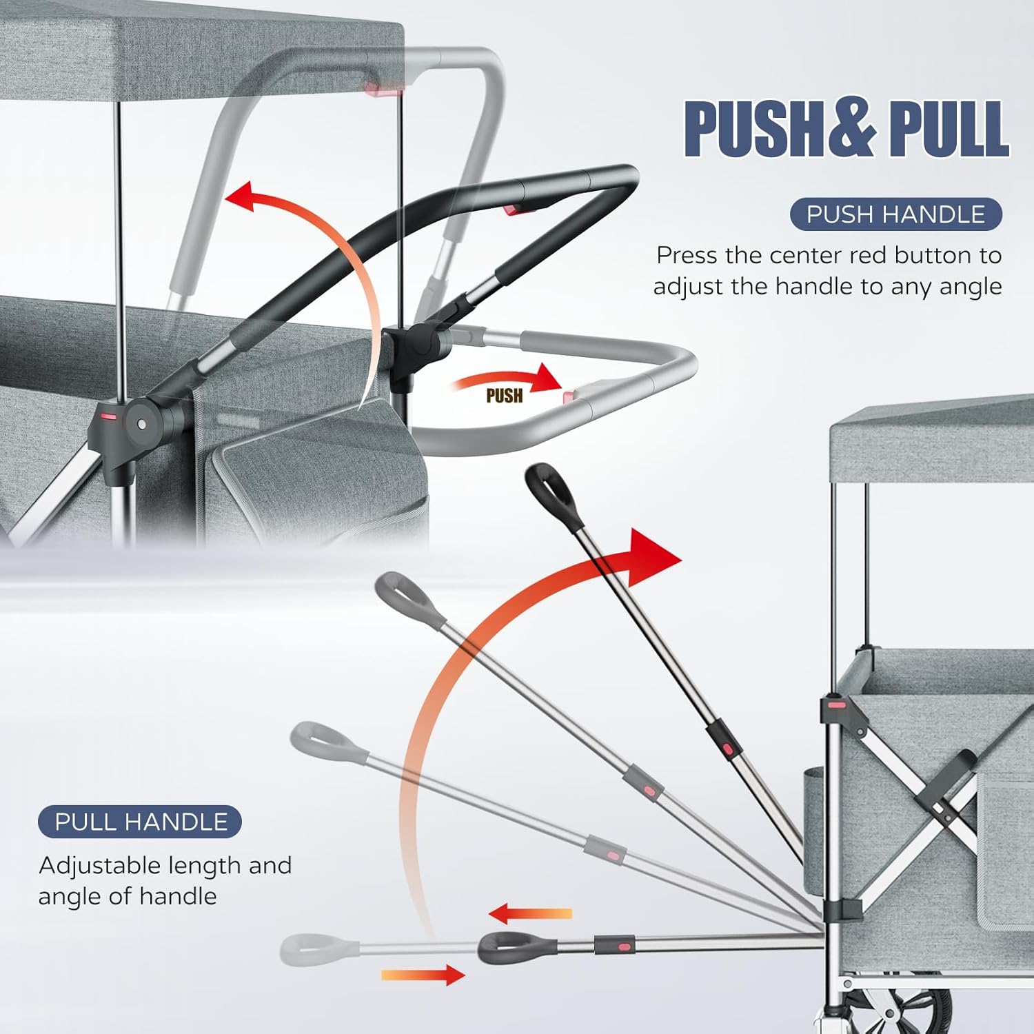 Specification: Foldable Wagons for Two Kids & Cargo, with 5-Point Harnesses,Adjustable Push/Pull Handle, Removable Sun Canopy, One-Step Locking Design, Suitable for Family Travel, Two Children Ride, Gift