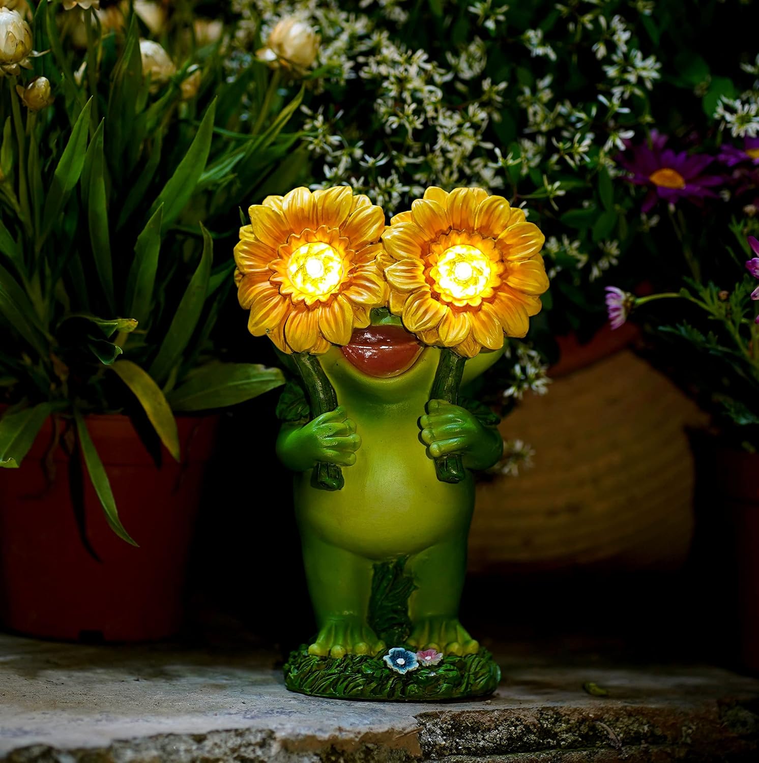 • Frog outdoor decor:This funny garden frog decoration can enhance your pleasant mood and cheerful atmosphere.The two sparkle eyes illuminates to the darkness and you will not be losing directions.