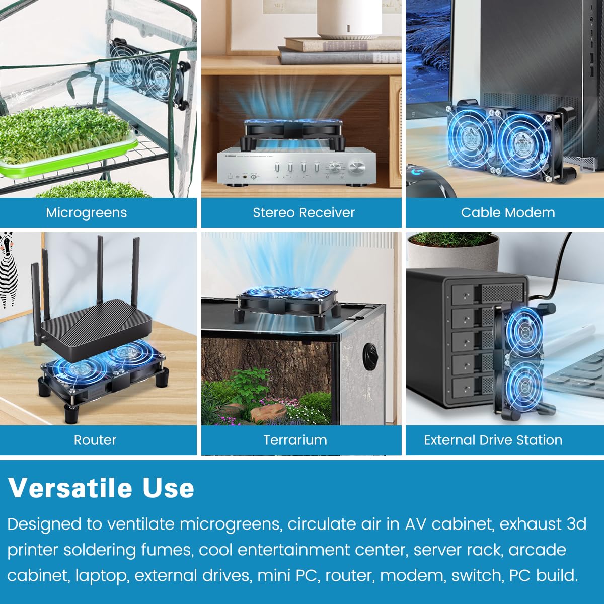 • Wide Application: 2 fans with speed controller; Designed to Cool external HD, receivers, modems, routers, DVRs, mini PC, video game consoles, computers, amplifiers, various electronics and components; Ventilate microgreens, Move Air in orchid/reptile terrarium; Circulate Air in AV cabinet with limited ventilation, or as an Exhaust fan for soldering station