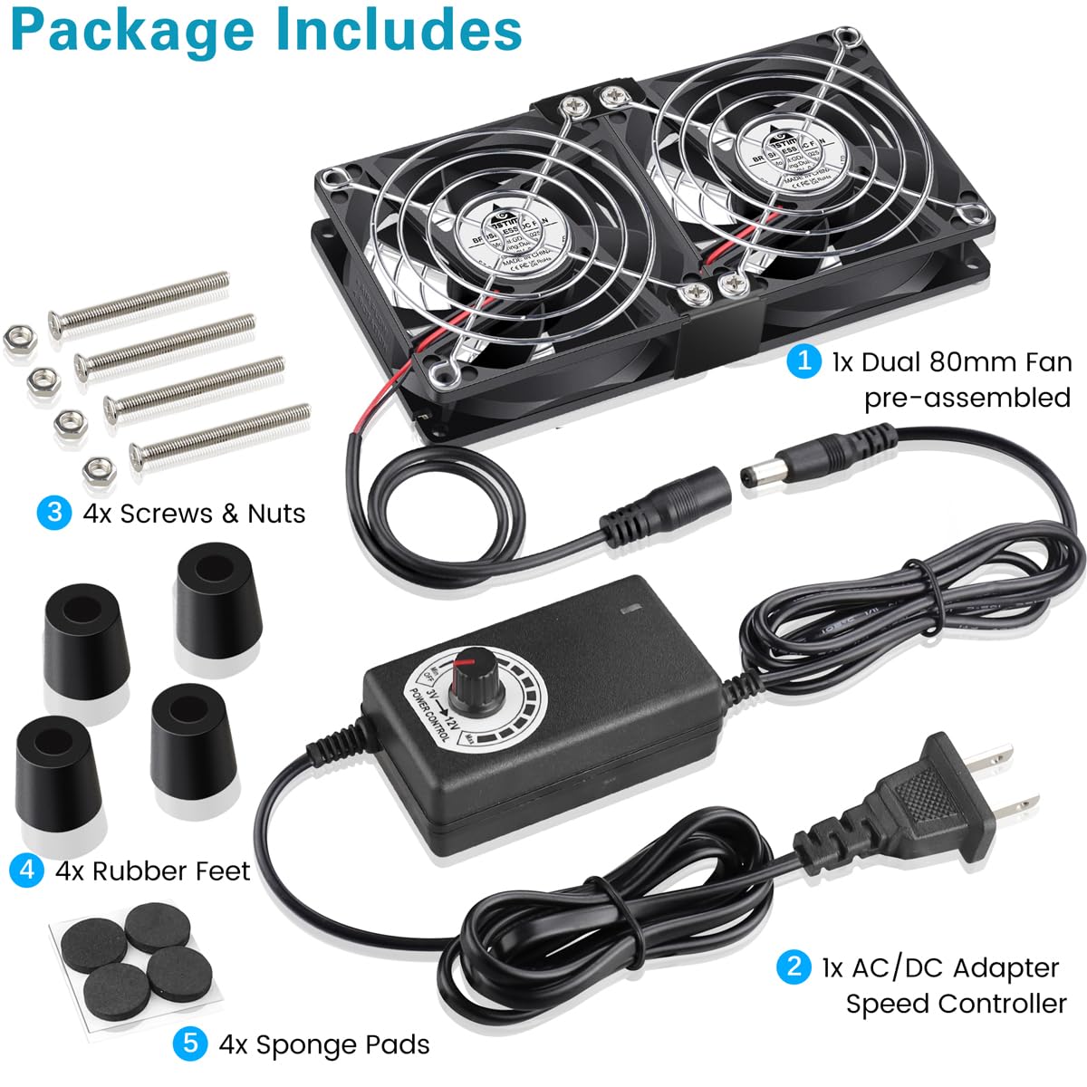 • What You Get: Includes a dual 80mm fans (double side fan grills pre-assembled), an AC to DC adapter with speed controller, 4 mounting screw set, 4 rubber feet and sponge pads for easy installation