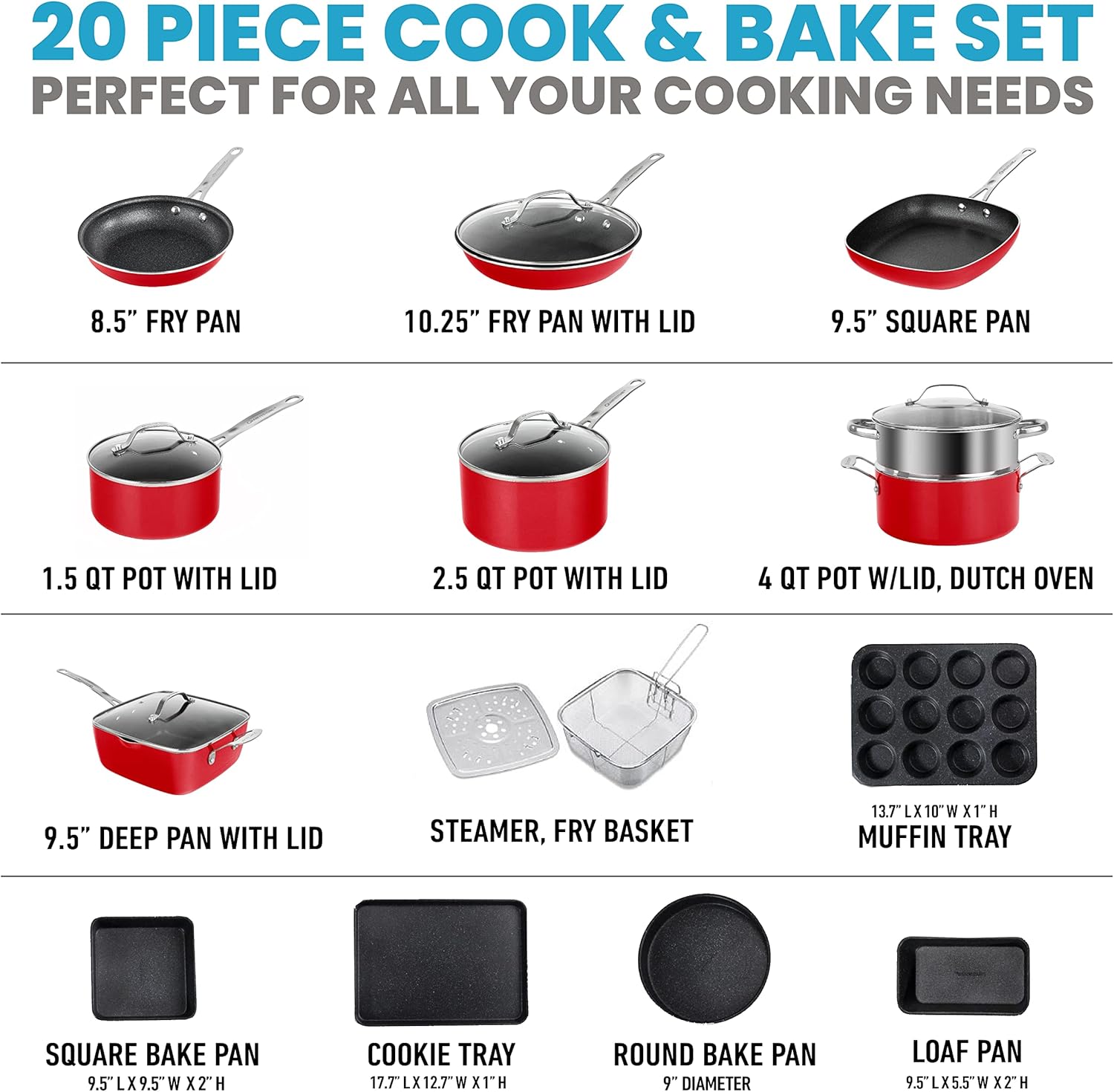 Specification: Granitestone Red Pots and Pans Set Nonstick, 20 Pc Kitchen Cookware Set & Bakeware Set with Mineral & Diamond Coating, Long Lasting Nonstick, Ultra Durable, Oven and Dishwasher Safe, 100% Toxin Free