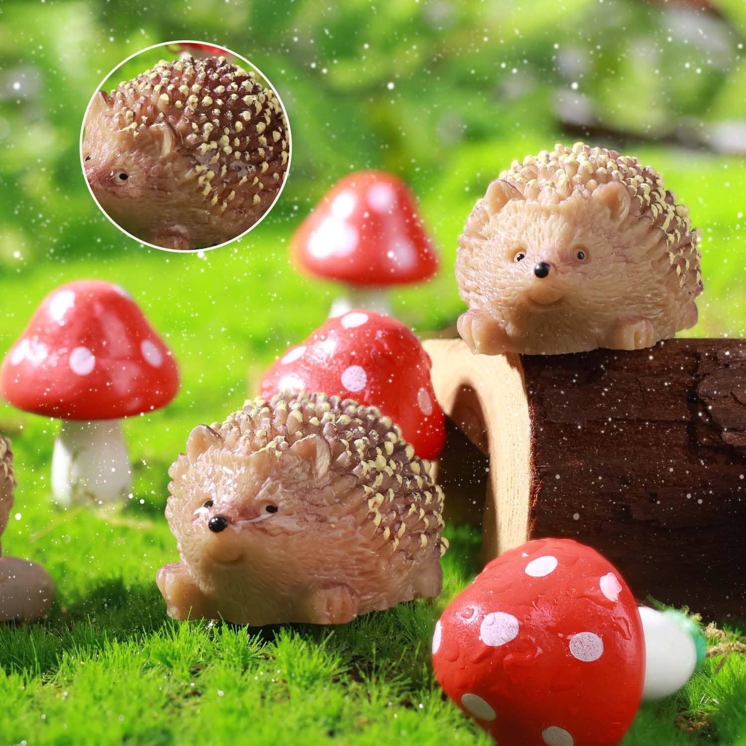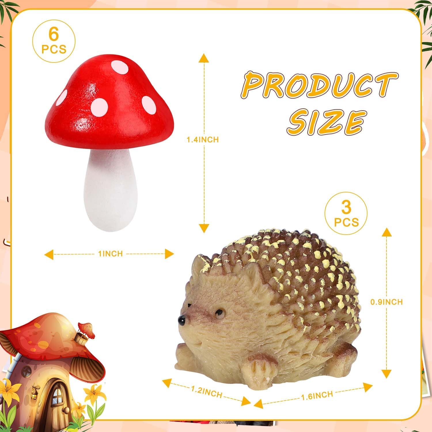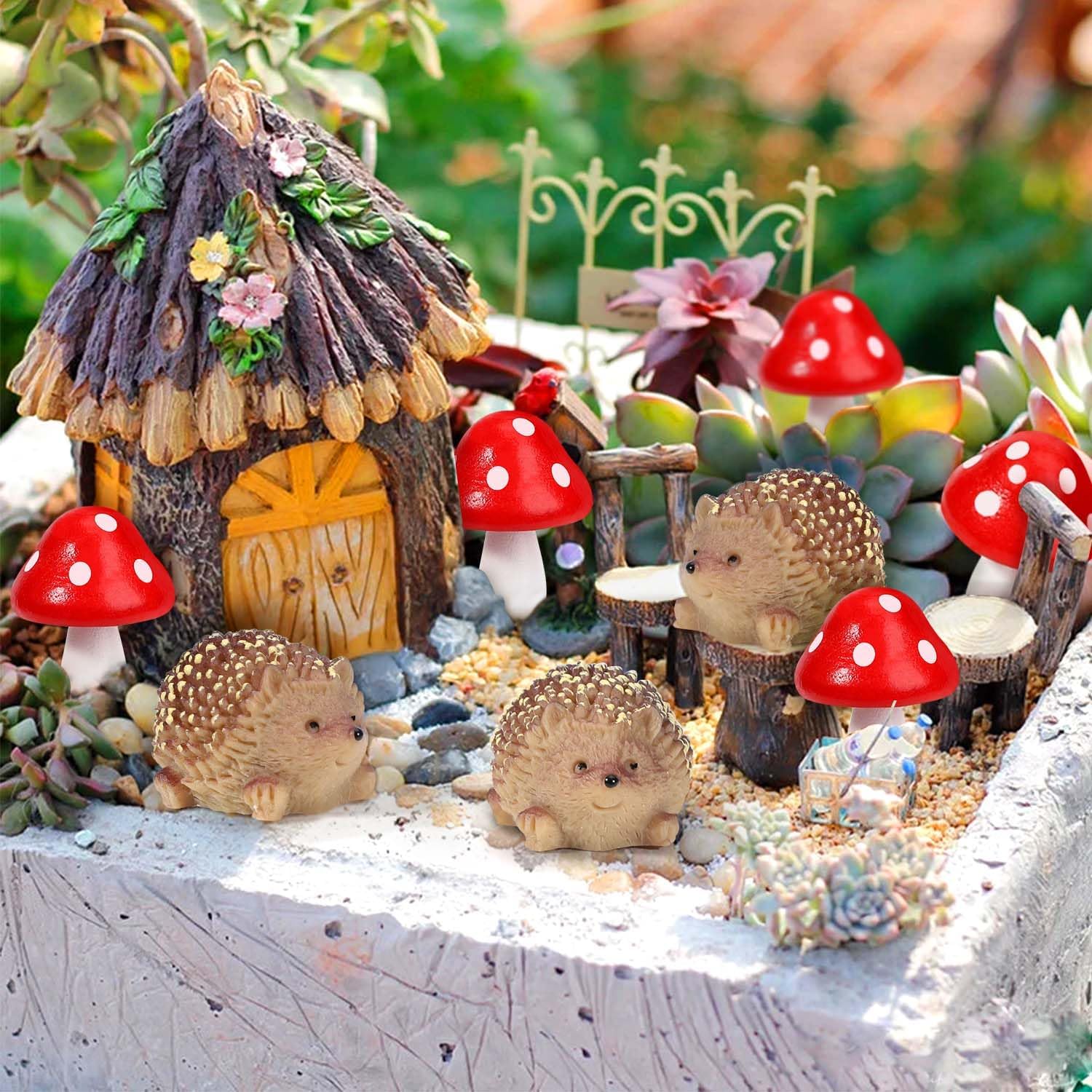 Fairy Garden Decor: The fairy garden accessories outdoor including 3 pieces cute hedgehogs and 6 pieces big red mushrooms, adorable and unique design, this fairy garden supplies is perfect for microscopic decoration