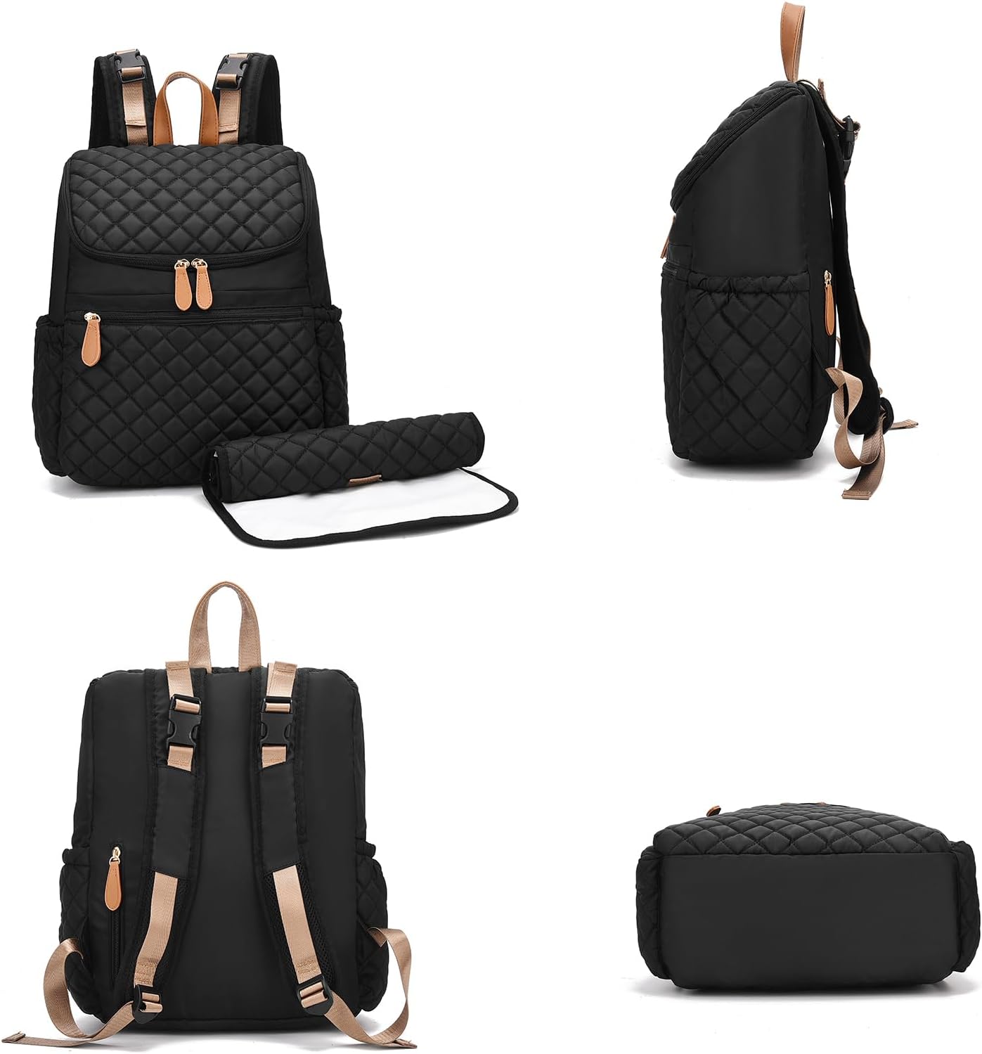 • MATERIAL: Our chic handy backpack diaper bags are made of tear-resistant water resistant fabric, strong zippers and lining. You don’t need to fear spilled milk or water, with a changing pad (size: 22.8”x12.5”)in