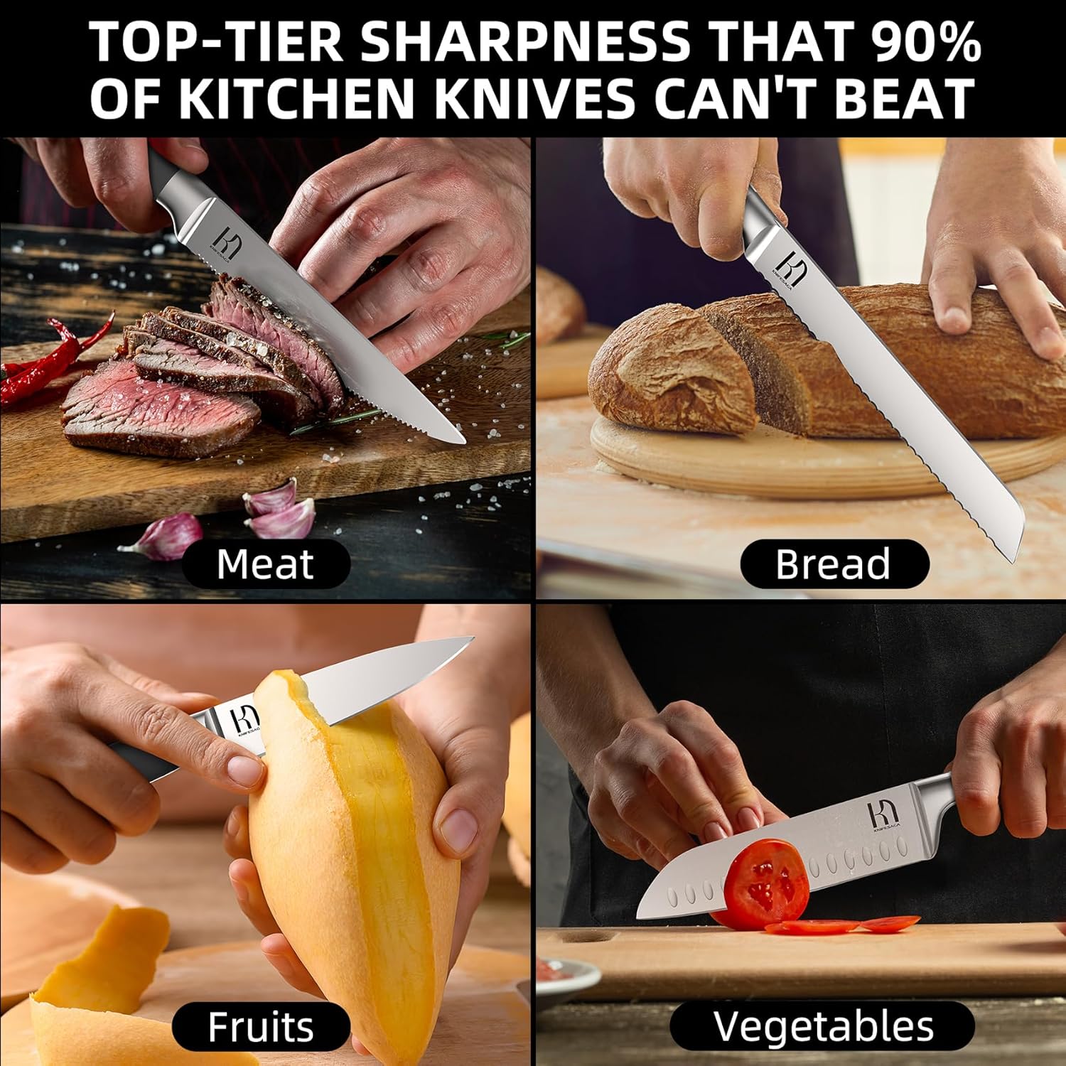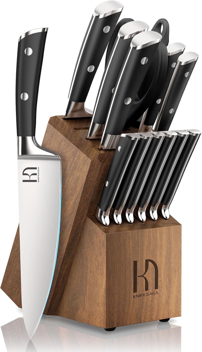 Specification: Knife Set 15 Pcs Japanese High Carbon Stainless Steel Kitchen Knife Sets with Block and Sharpener, Premium Razor Sharp Black Knives Block Set for Kitchen with Ergonomic Full-tang Handle