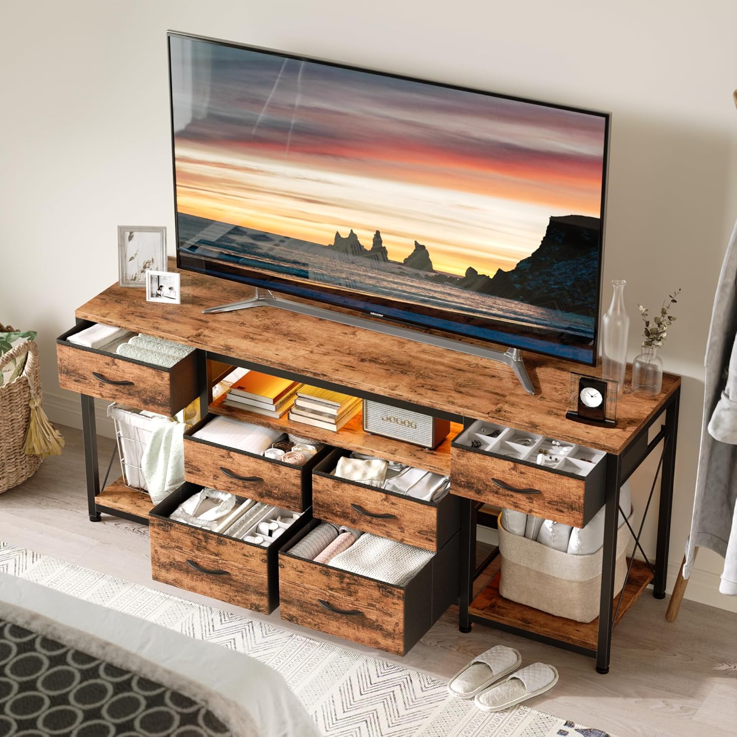 Specification: LED TV Stand with 6 Fabric Drawers and Power Outlet for 60 55 50 Inch TVs, Entertainment Center with Open Storage Shelves, Dresser TV Stand for Bedroom/Living Room,Rustic Brown