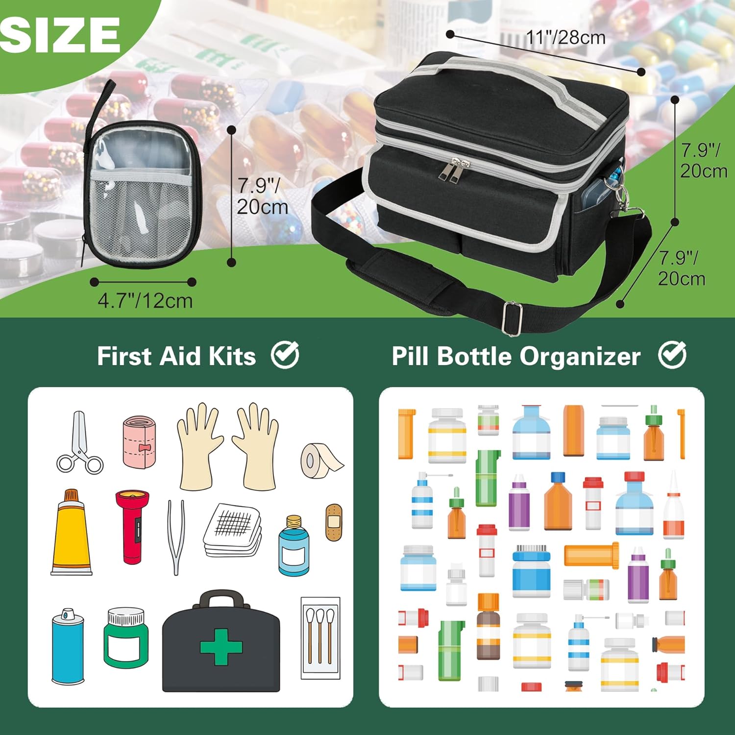 Medicine Storage Bag Pill Bottle Organizer with Portable Small Pouch Travel Medication Bottle Organizer for Emergency Home First Aid Box Kit Empty with Shoulder Strap Black