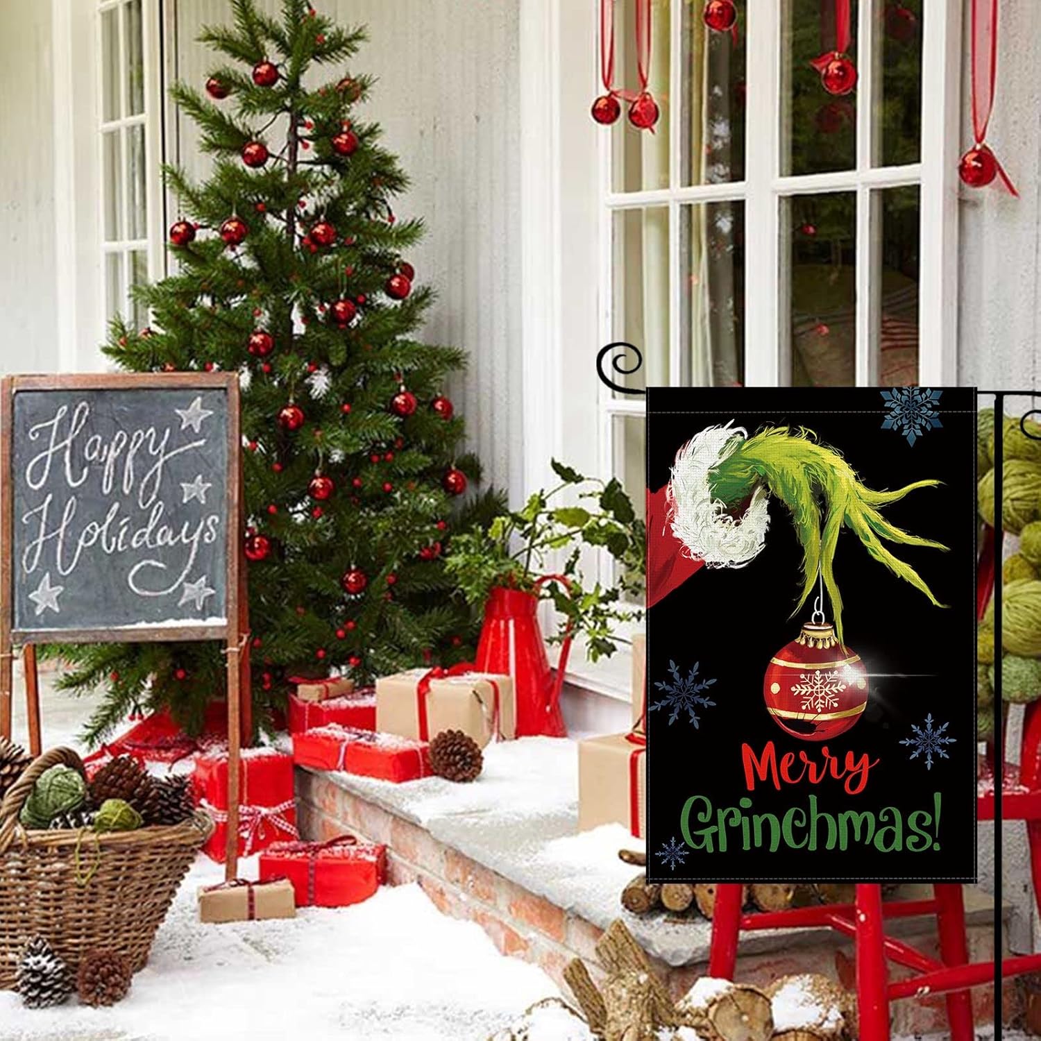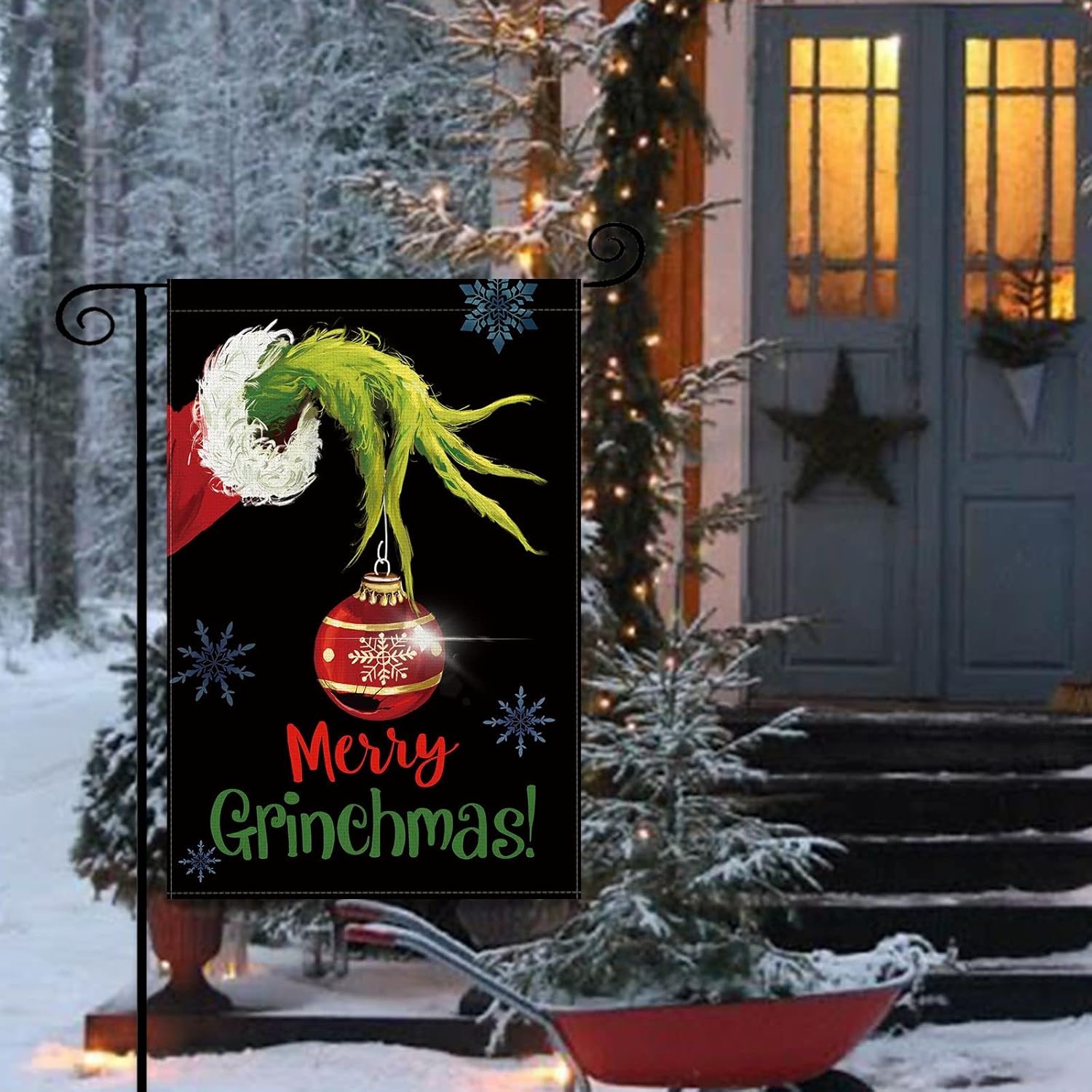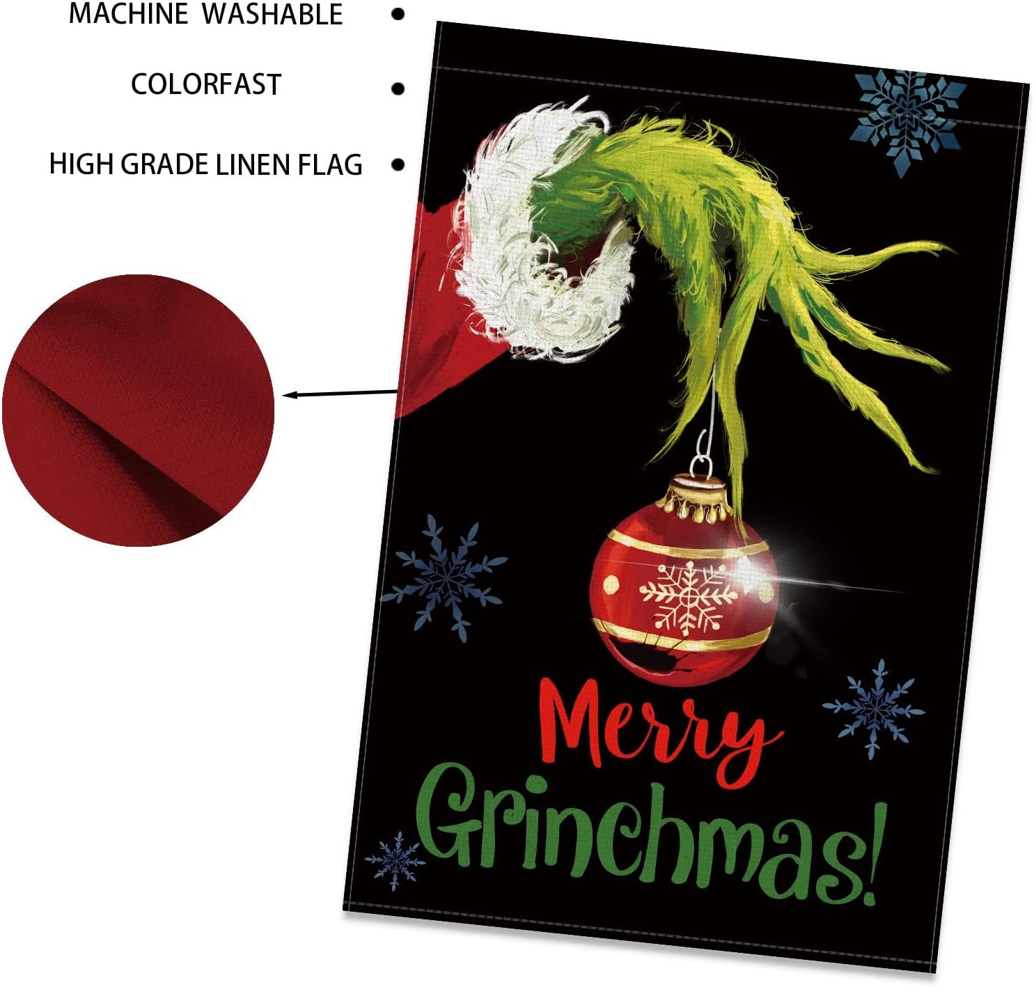 Specification: Merry Christmas Garden Flag: Grinch Christmas Decorations Outdoor Yard Flag 12×18 Double Sided Burlap Xmas Grinch Decor for Winter Holiday House Outside Party