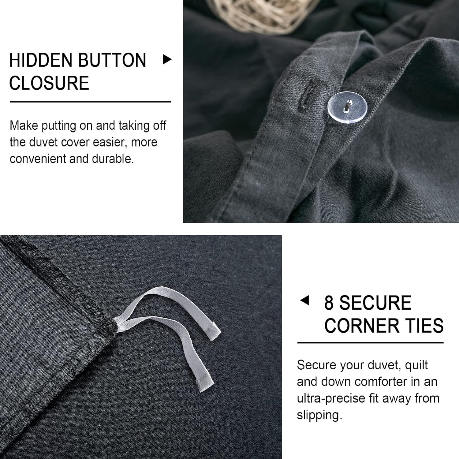 Specification: PHF Linen Duvet Cover Set King, Upgraded French Linen Blend Duvet Cover Set, Comfy Elegant Comforter Cover Set for Hot Sleepers, 1 Duvet Cover and 2 Pillowshams, 106″x 92″, Dark Grey Blackish