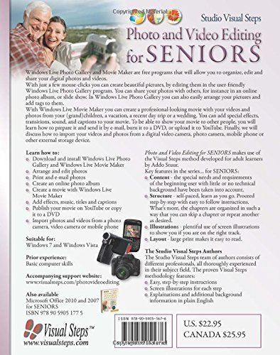 Windows Live Photo Gallery and Movie Maker are free programs that will allow you to organize, edit and share your digital photos and videos. In the step-by-step computer book Photo and Video Editing for Seniors you will learn to work with these photo and video editing programs from Windows Live. With just a few mouse-clicks you can create beautiful pictures, by editing them in the user-friendly Windows Live Photo Gallery program. You can share your photos with others, for instance in an online photo album, or slide show. In Windows Live Photo Gallery you can also easily arrange your pictures and add tags to them. With Windows Live Movie Maker you can create a professional-looking movie with your videos and photos from your (grand)children, a vacation, a recent day trip or a wedding. You can add special effects, transitions, sound, and captions to your movie. To be able to show your movie to other people, you will learn how to prepare it and send it by e-mail, burn it to a DVD, or upload it to YouTube. Finally, we will discuss how to import your videos and photos from a digital video camera, photo camera, mobile phone or other external storage device.