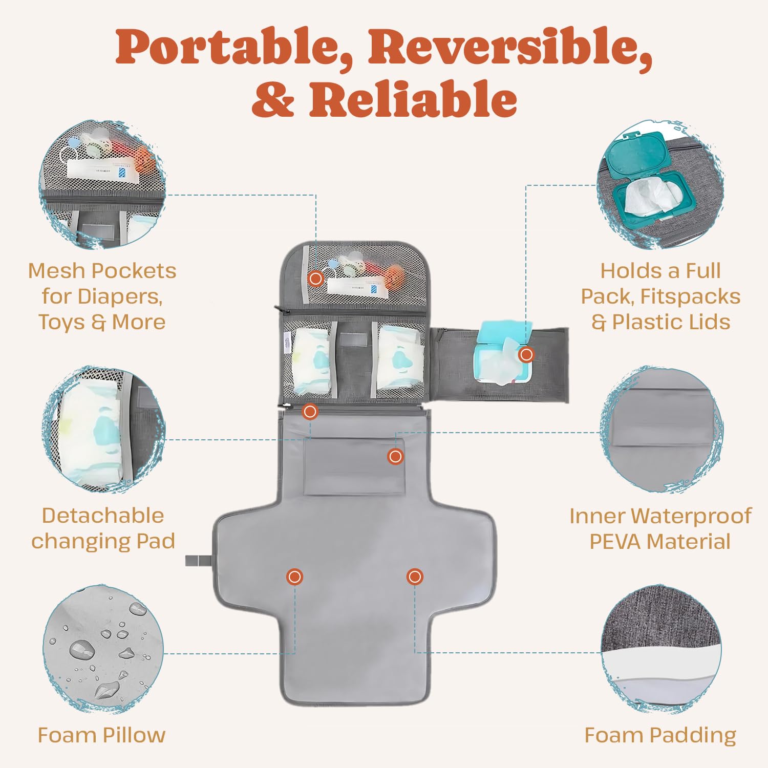 Keep The Essentials Close: Our portable changing pad for baby is designed with special pockets and mesh compartments that allows quick and easy access to baby wipes, diapers, baby powders, toys and lotions, keeping the baby essentials safely stored and always at hand.