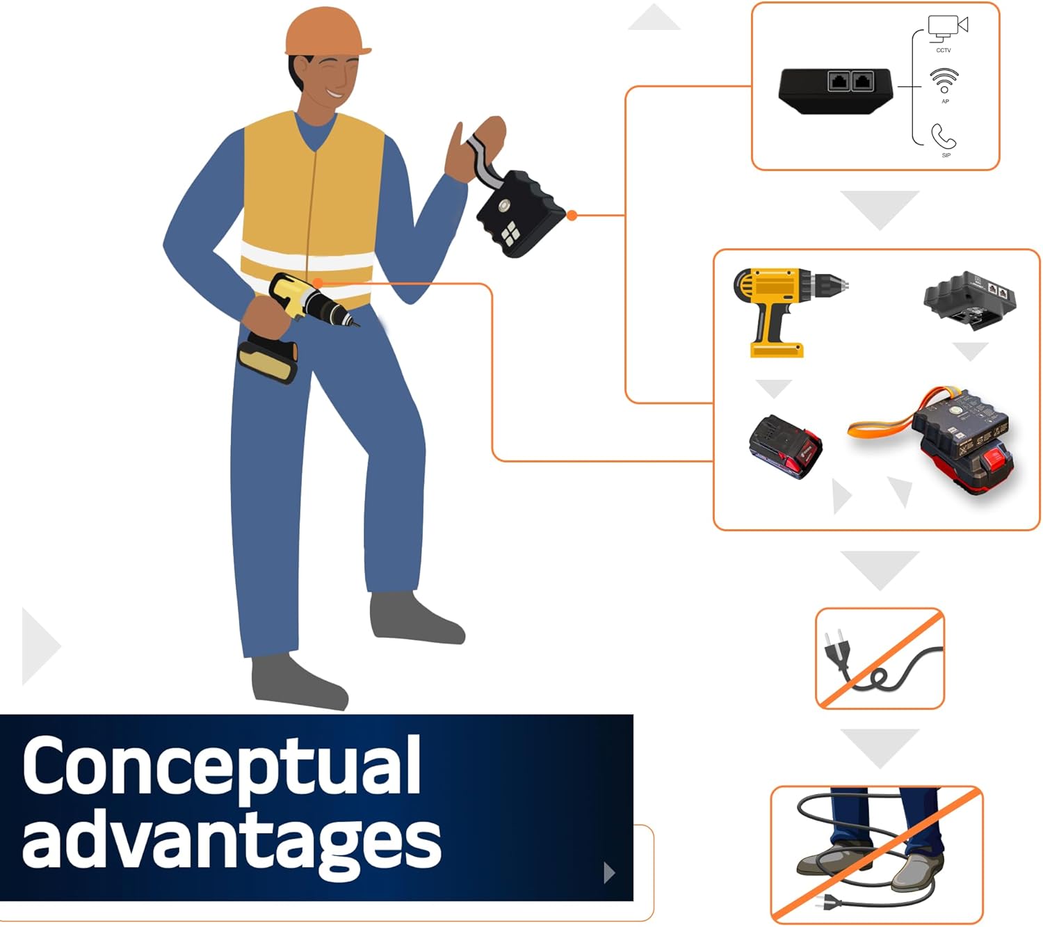 Specification: Portable PoE+ Injector Active & Passive (24V/50V, IEEE 802.3af/at/bt, up to 50W) | Compatible with DeWalt & Milwaukee Power Batteries | Battery Powered | 1 Gigabit Passthrough | Ethernet Adapter