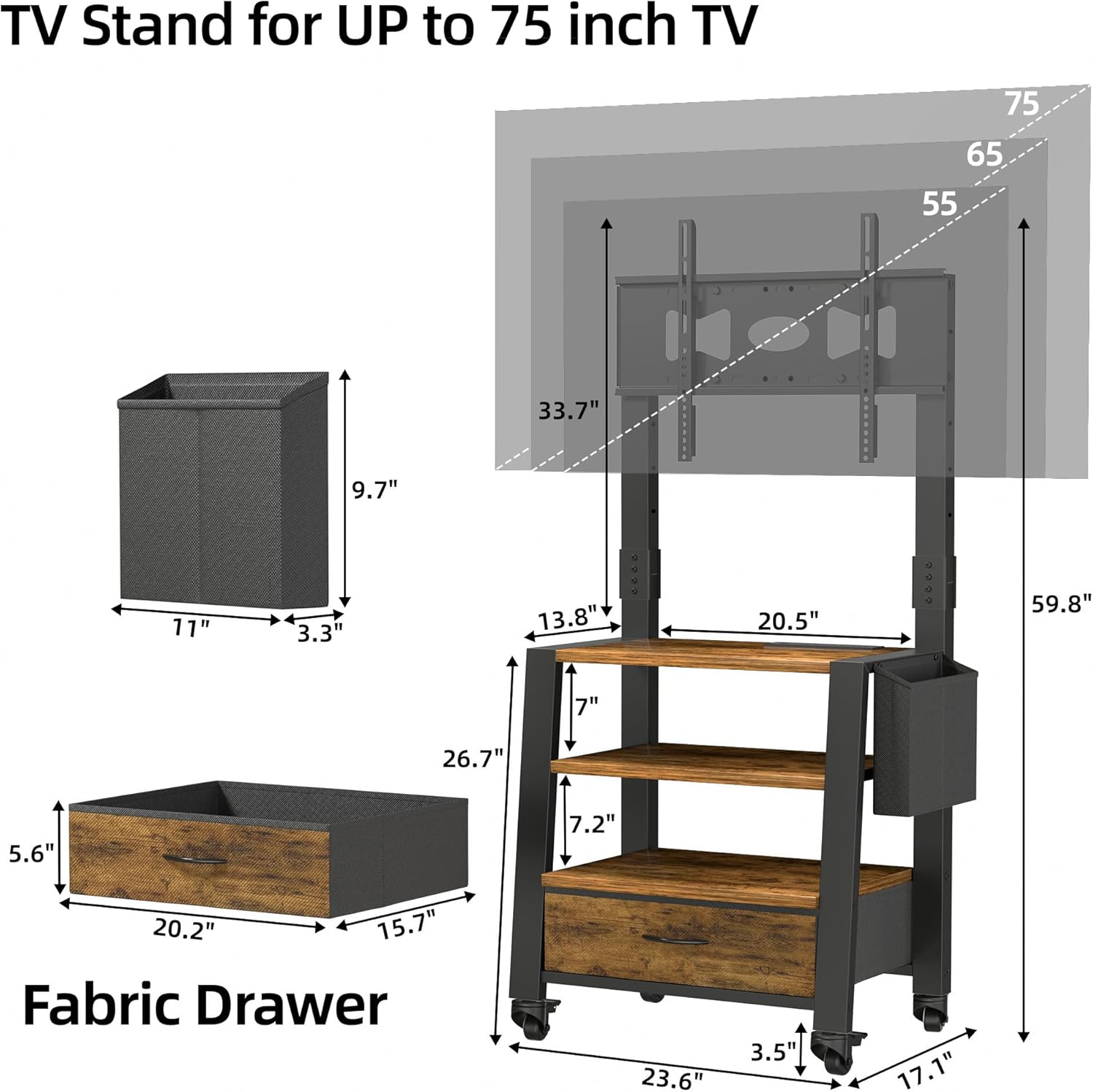 Specification: Rolling TV Stand with Mount and Fabric Drawer for 32-75″ TV – Entertainment Center with Charging Station and Industrial TV Console Table for Living Room, Bedroom – Rustic Brown