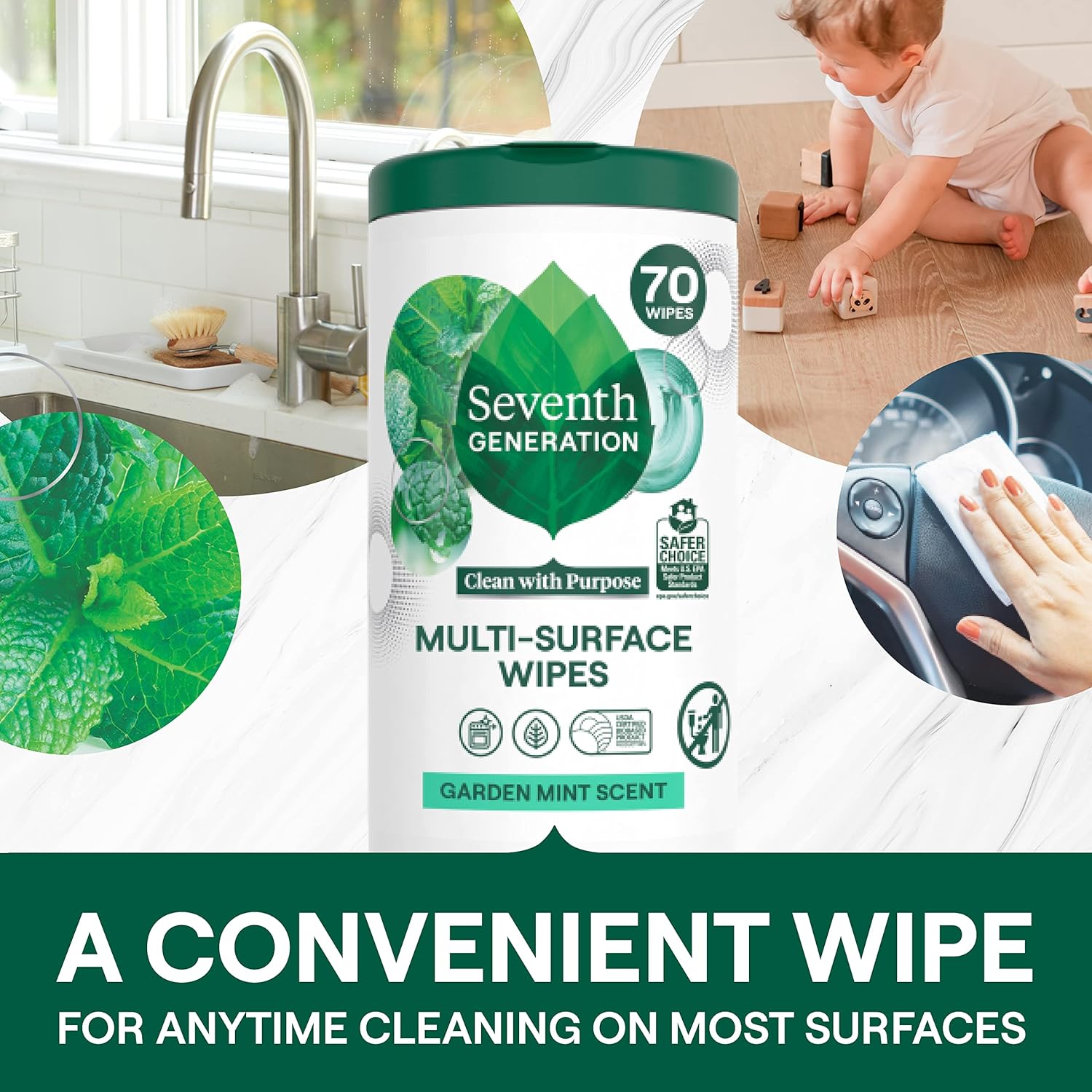 Specification: Seventh Generation Multi Purpose Wipes All Purpose Cleaning Garden Mint scent with 100% Essential Oils and Botanical Ingredients 70 count, Pack of 3