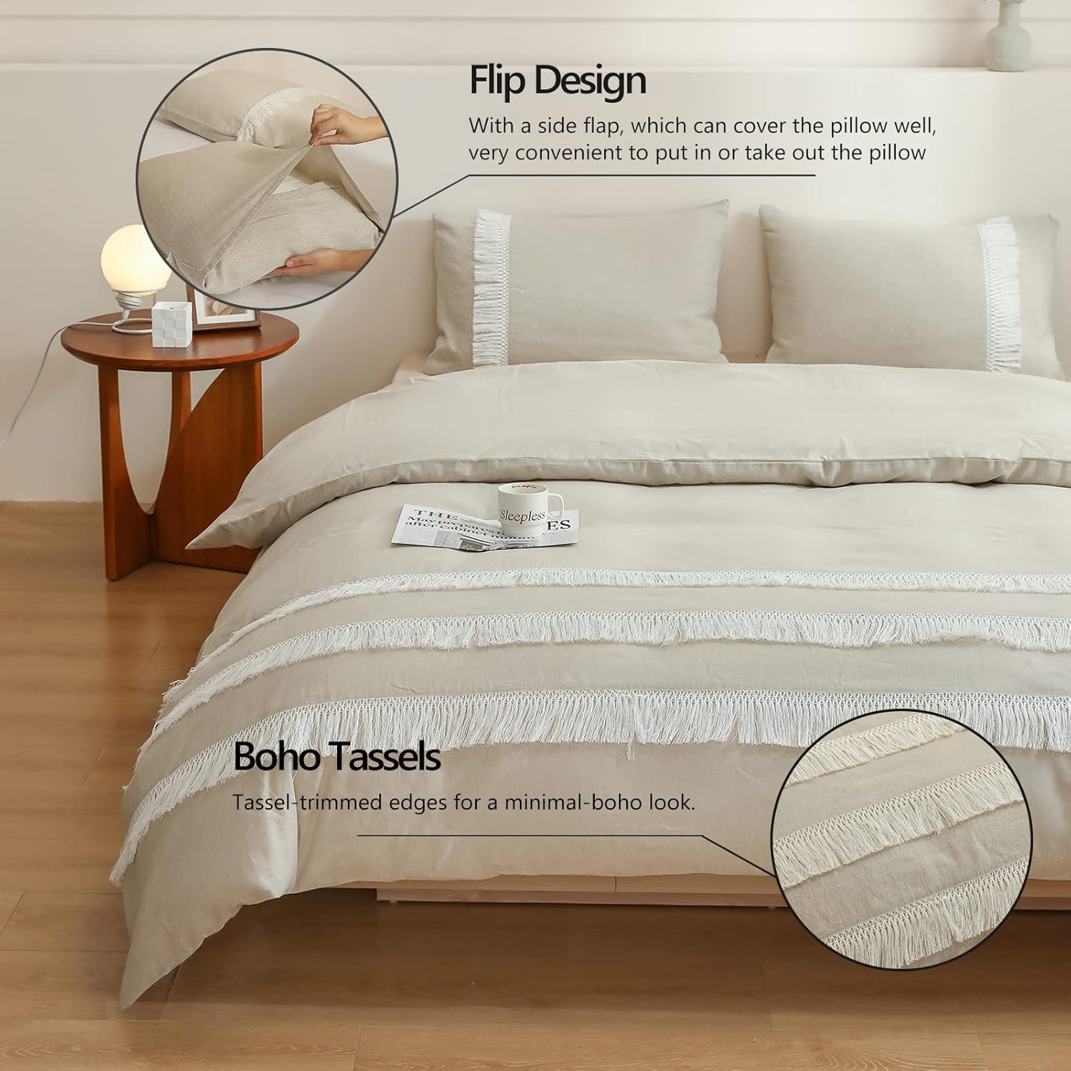Specification: Simple&Opulence Boho Linen Duvet Cover Set with Tassel Fringe, 3Pcs Flax Cotton Blend Macrame Comforter Set-1 Duvet Cover&2 Pillowcases, Soft Breathable Chic Bedding with Button Closure(Linen, King)