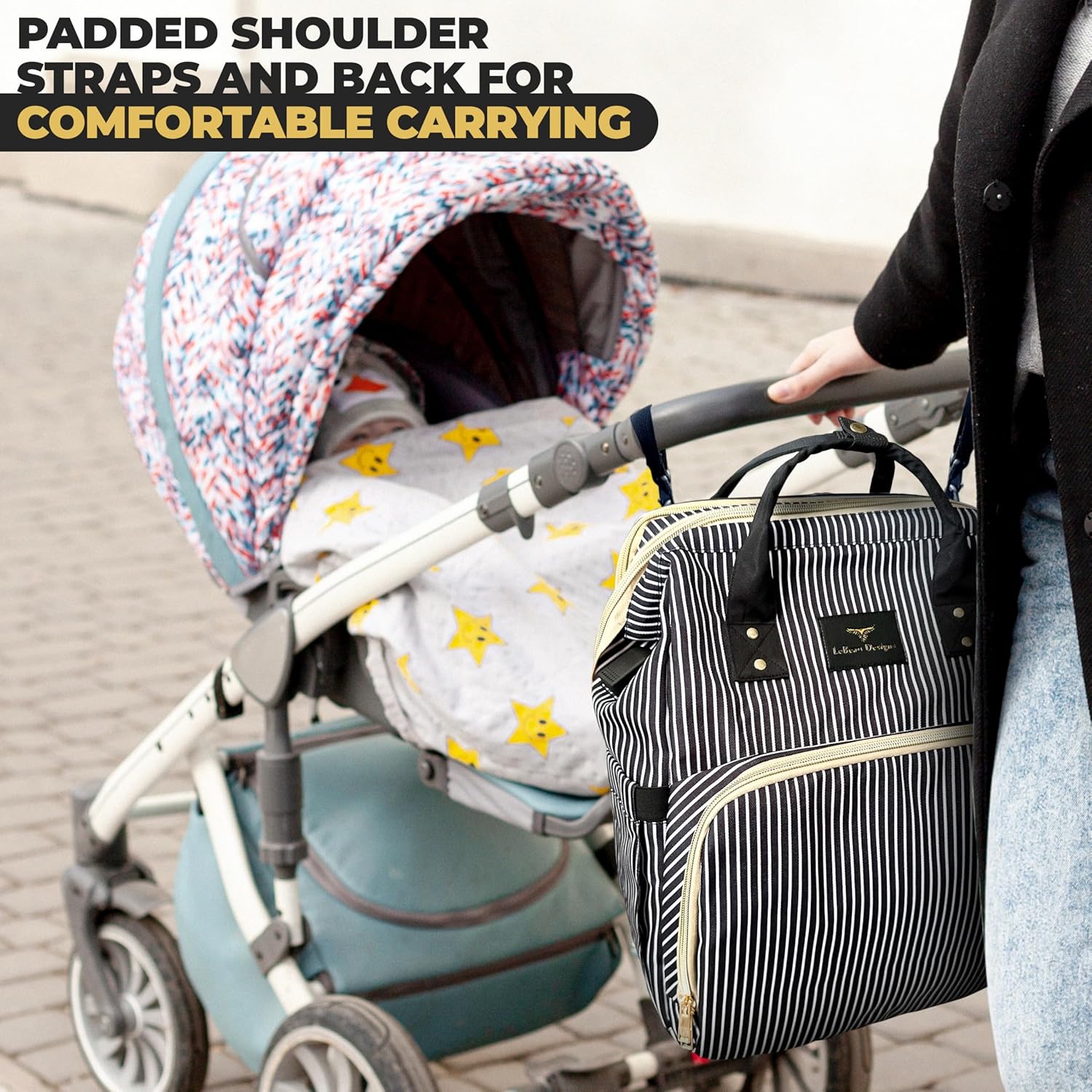 Specification: Striped Baby Diaper Bag Backpack – Baby Necessities Diaper bags, Large Travel Backpack With Changing Pad and Stroller straps, Diaper Bag Essentials, Baby Search Registry