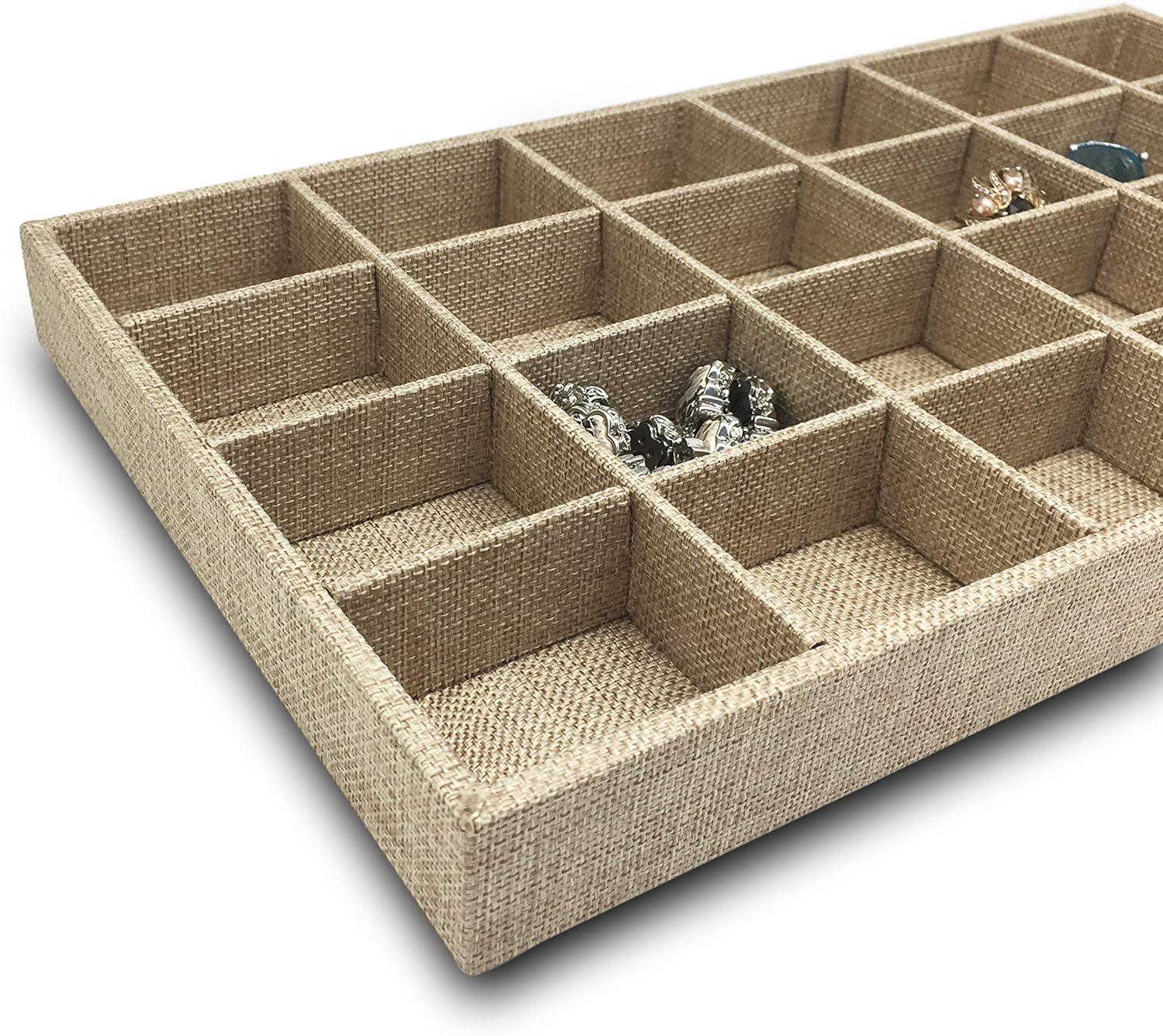 The Display Guys – Stackable Jewelry Tray and Organizer – for Drawers, Dressers, Store Display (24 Compartments, Beige Burlap)