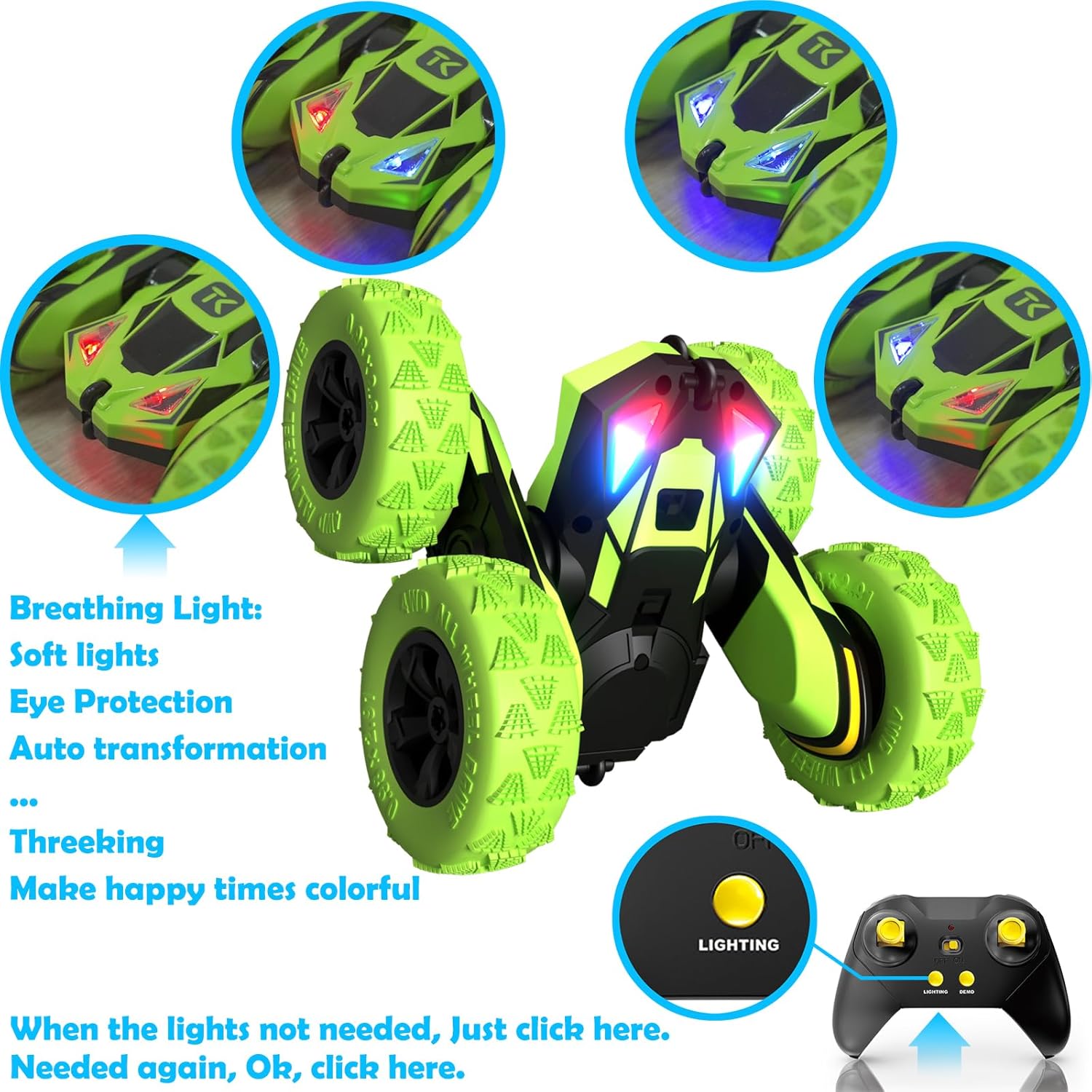 Specification: Threeking RC Stunt Cars Remote Control Car Double-Sided Driving 360-degree Flips Rotating Car Toy, Green