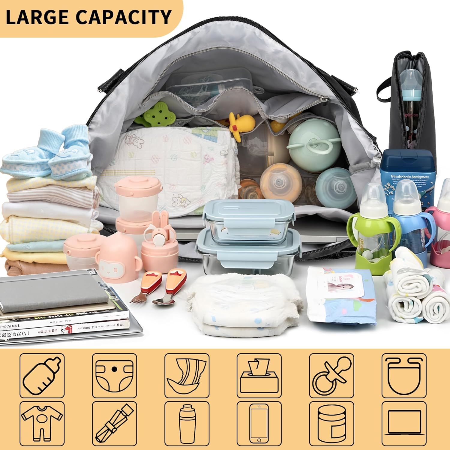 TORIBIO 6pcs Large Diaper Bag Tote with Changing Pad & Toiletries/Baby Bottle Pouches, Baby Diaper Bag, Mommy Bag for Hospital Weekender Travel with Straps & Stroller Hook, 17″ x5.5″ x11.8″