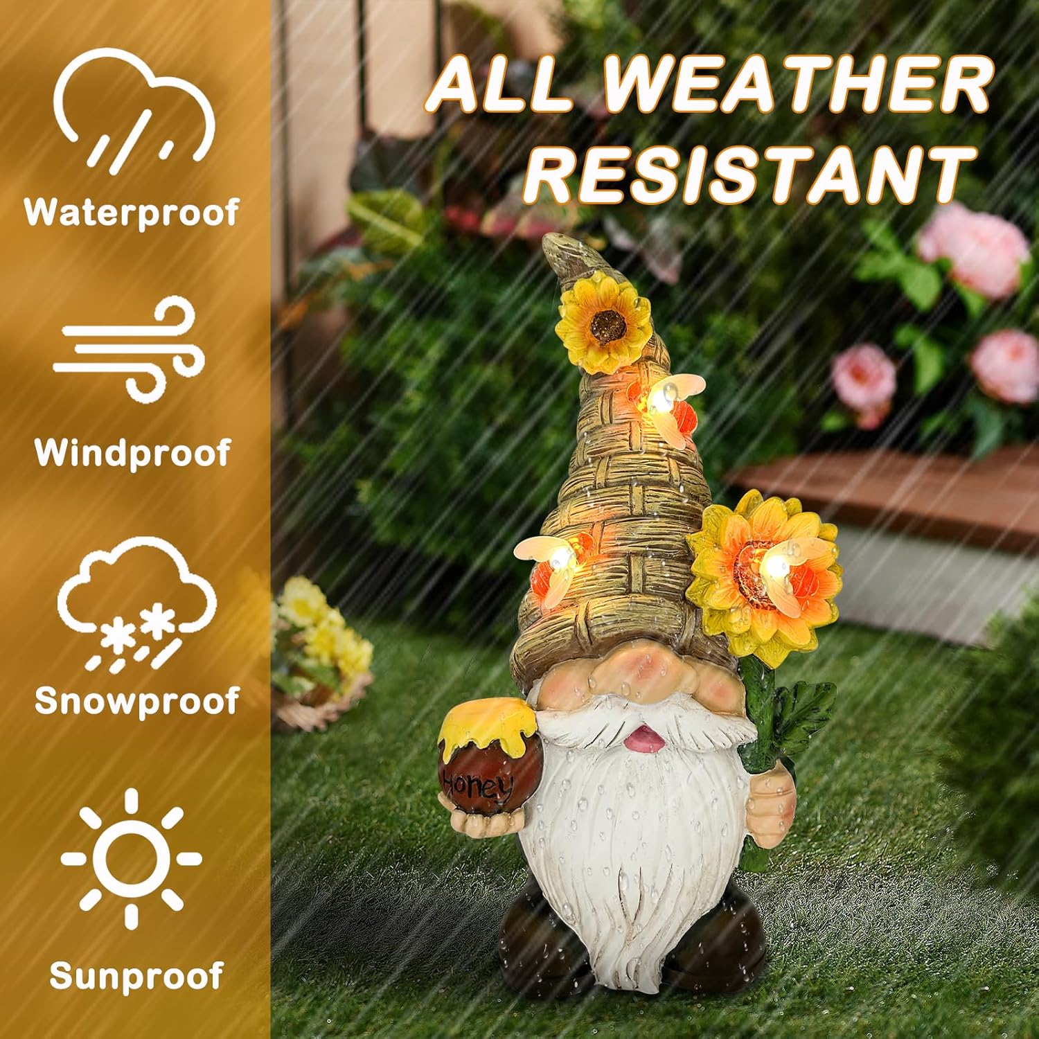 Specification: Uniboho Garden Gnome Statue Outdoor Garden Decor Large Resin Sunflower Gnome Holding Honey Jar with Solar Bee Lights for Garden Yard Decorations Patio Lawn Outside Porch Lawn Decor Gnomes Gifts 12″