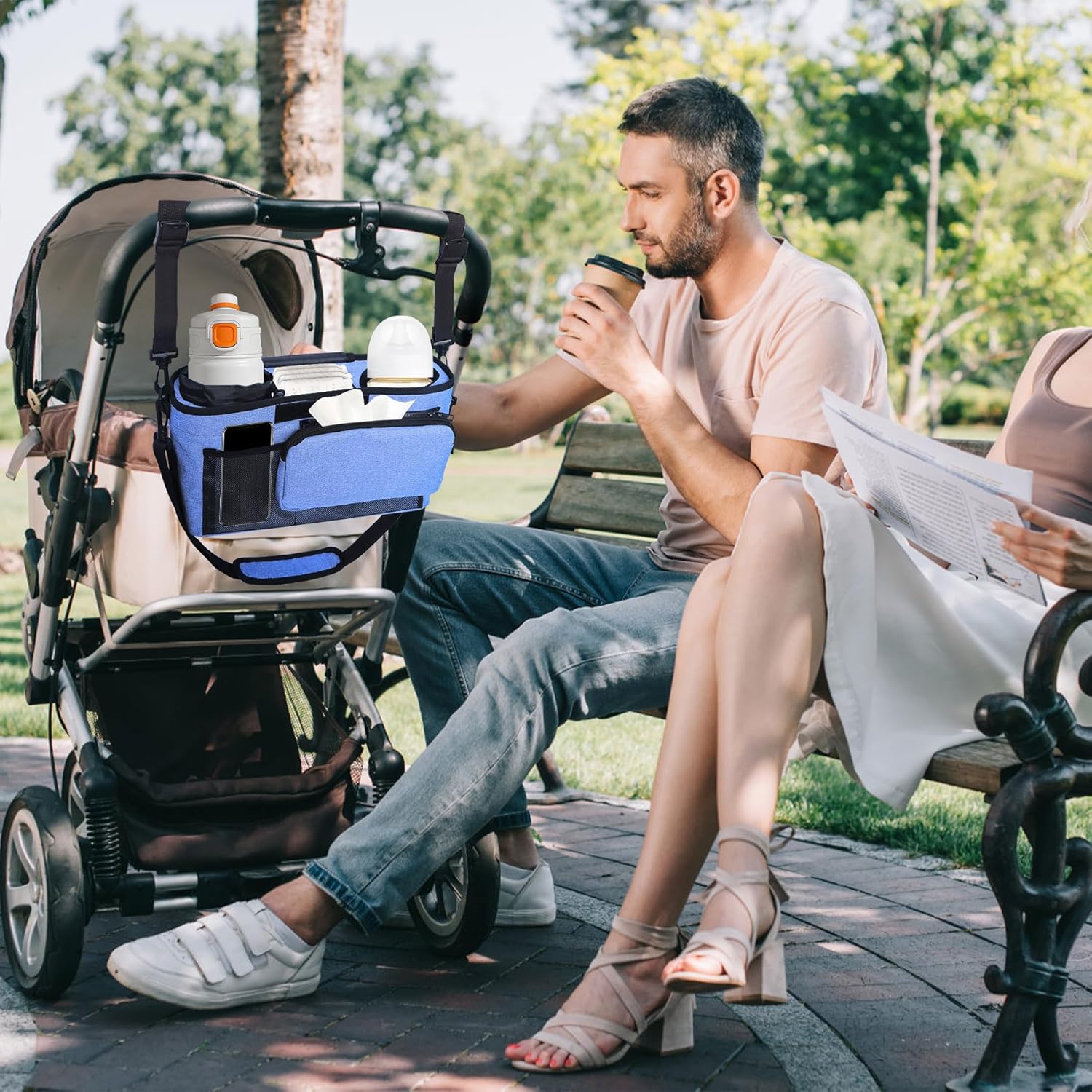 Specification: Universal Stroller Organizer, 2 Heightened Insulated Cup Holders, Detachable Zippered Pocket, Adjustable Shoulder Strap, Non-Slip Secure Hooks Accessories,Large Capacity for Baby Essentials Blue