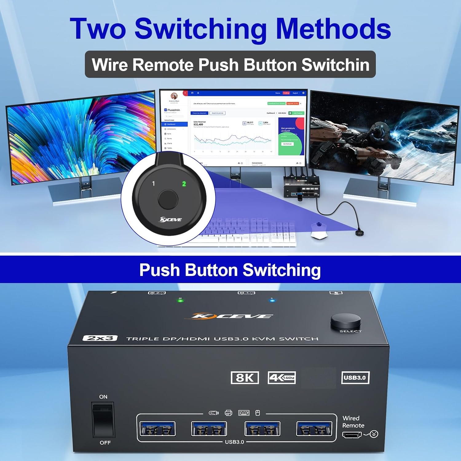 Specification: USB3.0 HDMI KVM Switch 3 Monitors 2 Computers 8K@60Hz 4K@144Hz,Displayport and HDMI Dual Monitor KVM Switch with 4 USB 3.0 Port for Keyboard Mouse Printer,Wired Remote, 2 HDMI+1 Displayport KVM