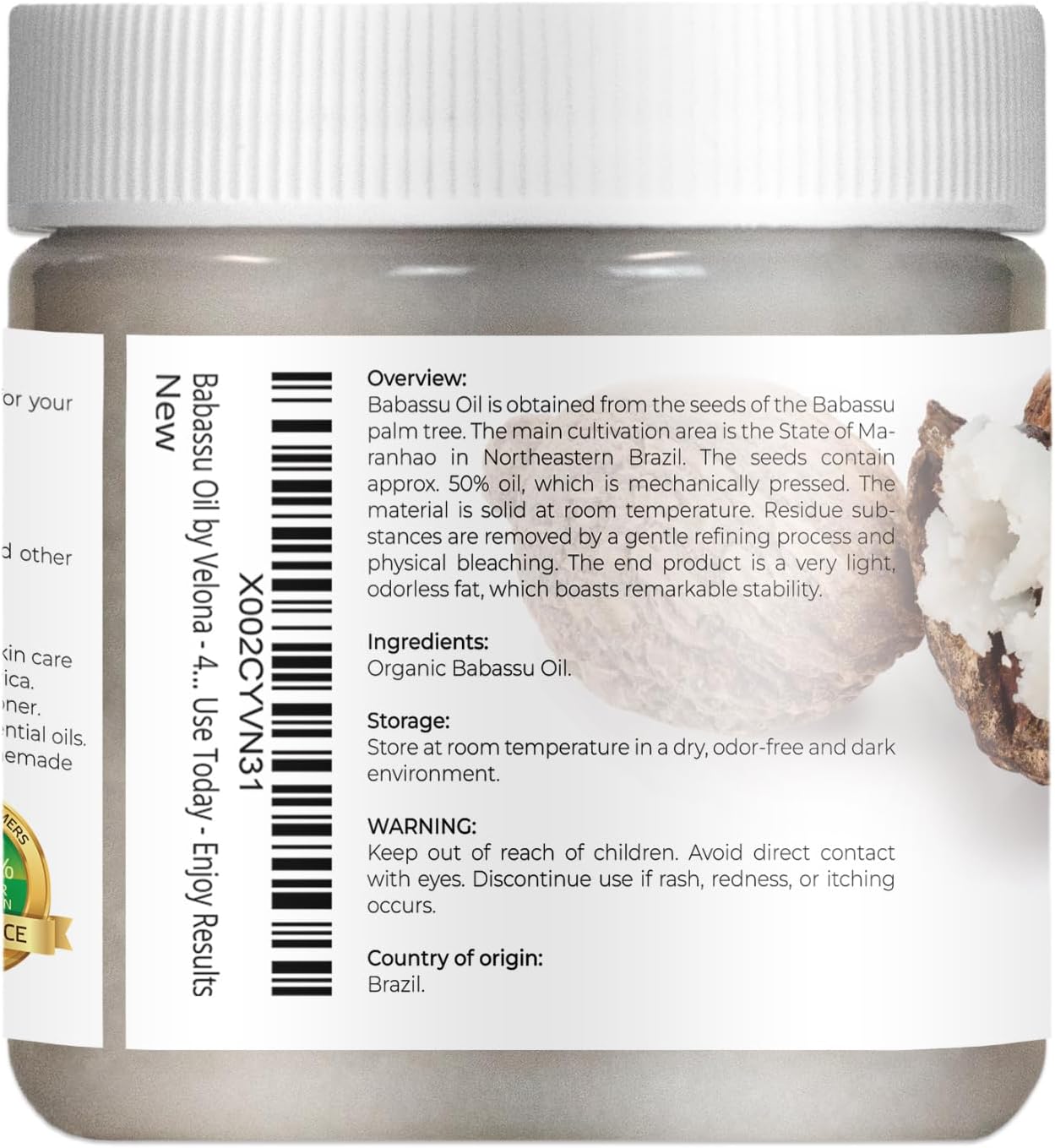 Specification: velona Babassu Oil USDA Certified Organic – 4 Fl Oz | 100% Pure and Natural Carrier Oil | Refined, Cold Pressed | Face, Hair, Body & Skin Care and Cooking | Use Today – Enjoy Results