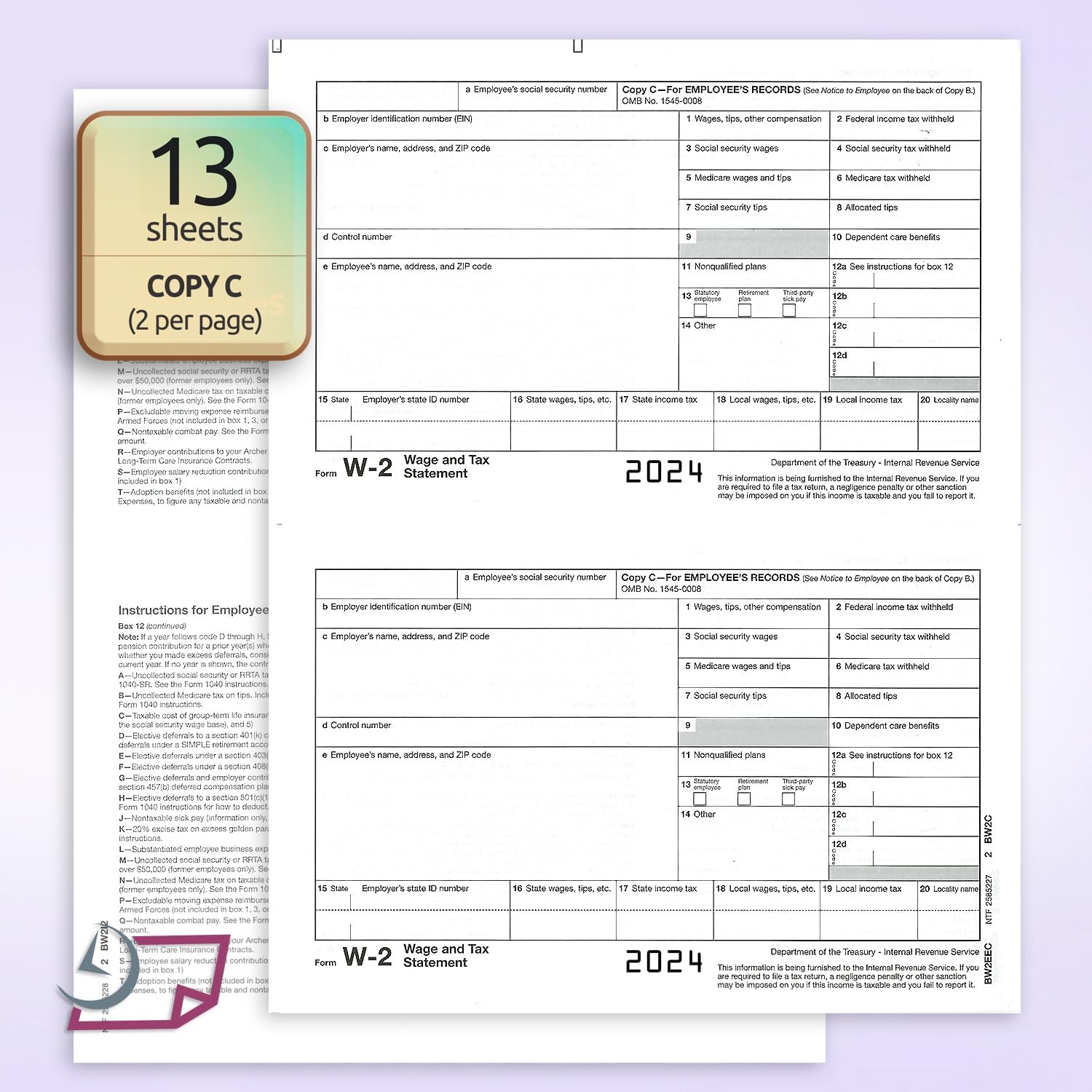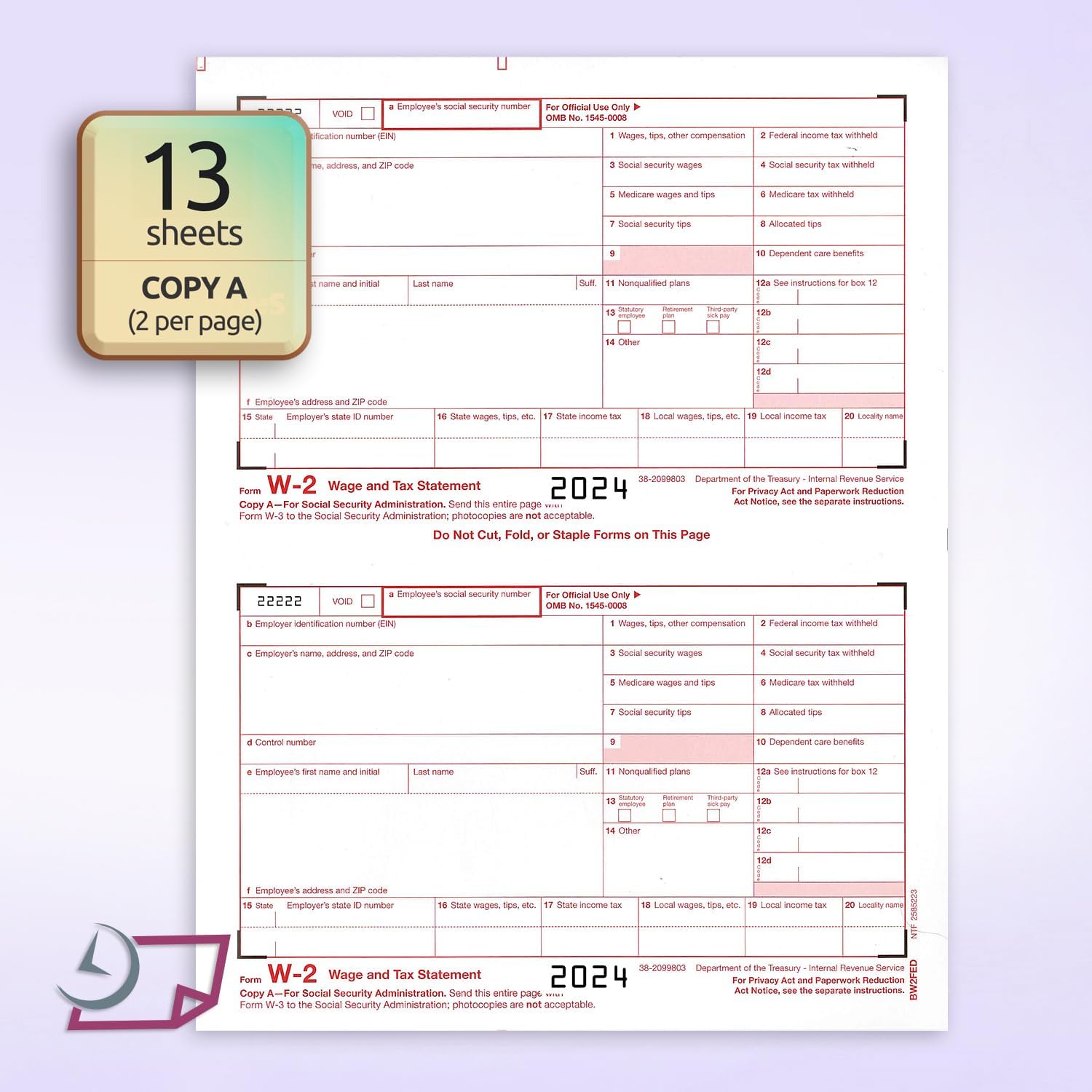 • FORMS INCLUDED: 25 Copy A (13 Sheets – 2 per sheet | 25 Copy B (13 Sheets – 2 per sheet | 25 Copy C (13 Sheets – 2 per sheet | 25 Copy D (13 Sheets – 2 per sheet | 3 Sheets W3 Transmittal Forms | 25 Self Sealing Envelopes