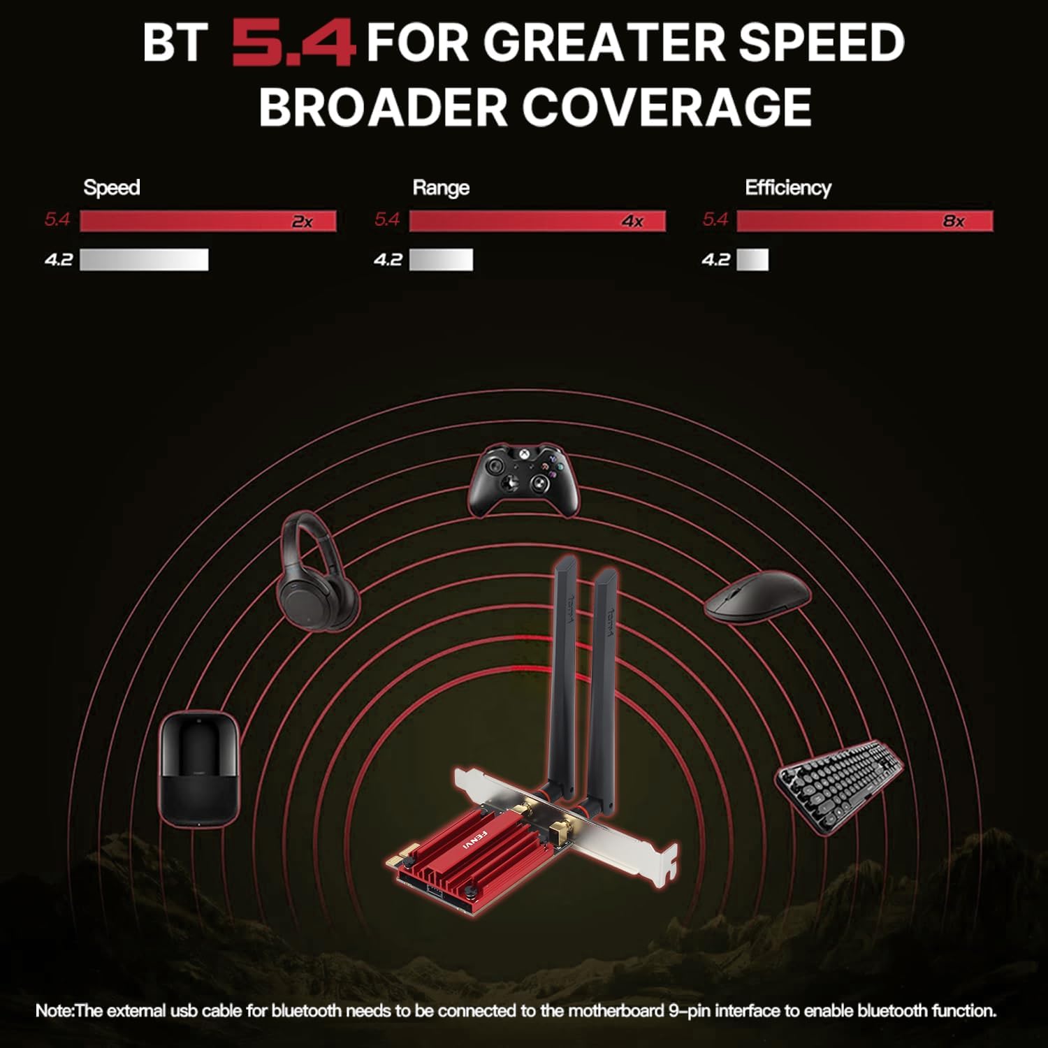 • 【Bluetooth 5.4 Technology】: Besides the wireless network connection, this PCIe WiFi adapter also supports Bluetooth 5.4 technology for the connection to various bluetooth devices to achieve file transfering, audio device connection and so on, faster transfer speeds, connection stability, lower power consumption than 5.3.