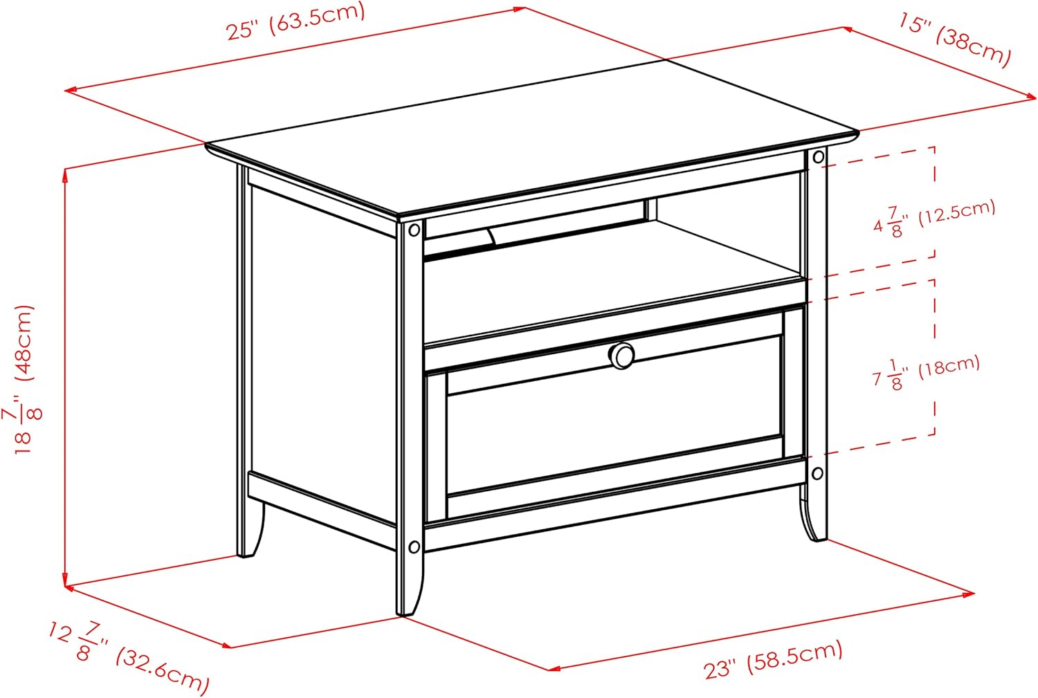 TV Stand assembled size is 25″ x 14.9″D x 18.9″H. Holds up to 32″ flat screen TV.
