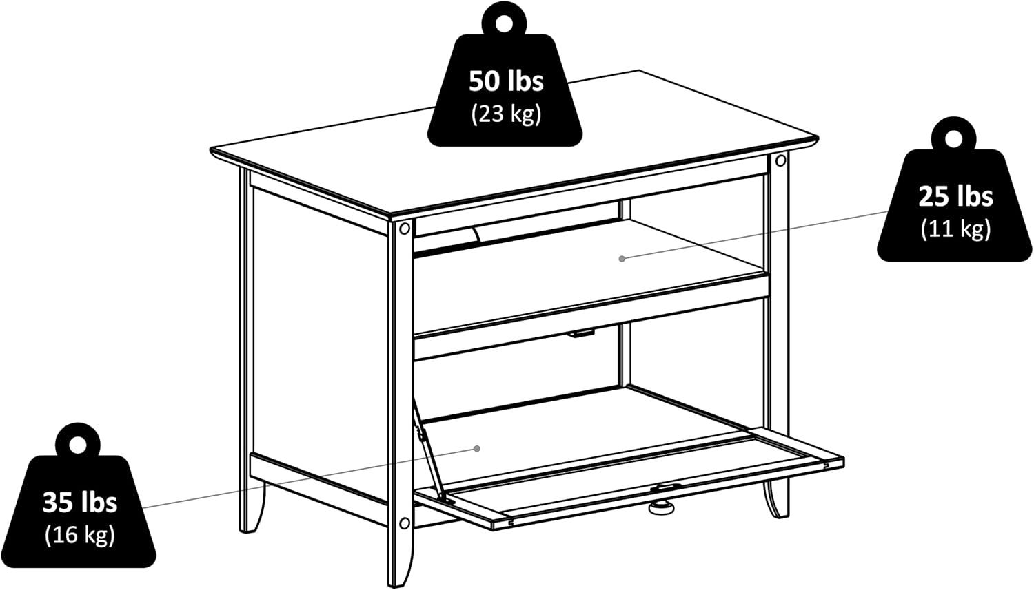 Open storage is 20.6″W x 11.8″D x 4.9″H. Pull down door opens to 20.6″W x 11.8″D x 6.4″H